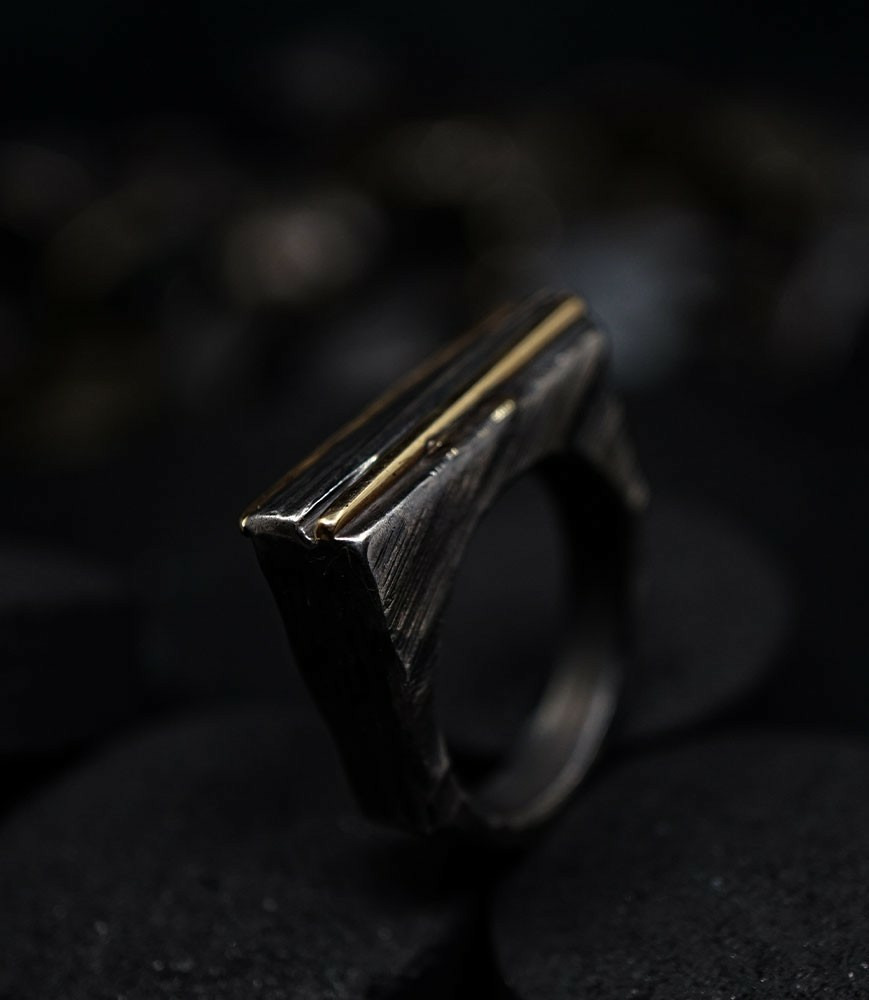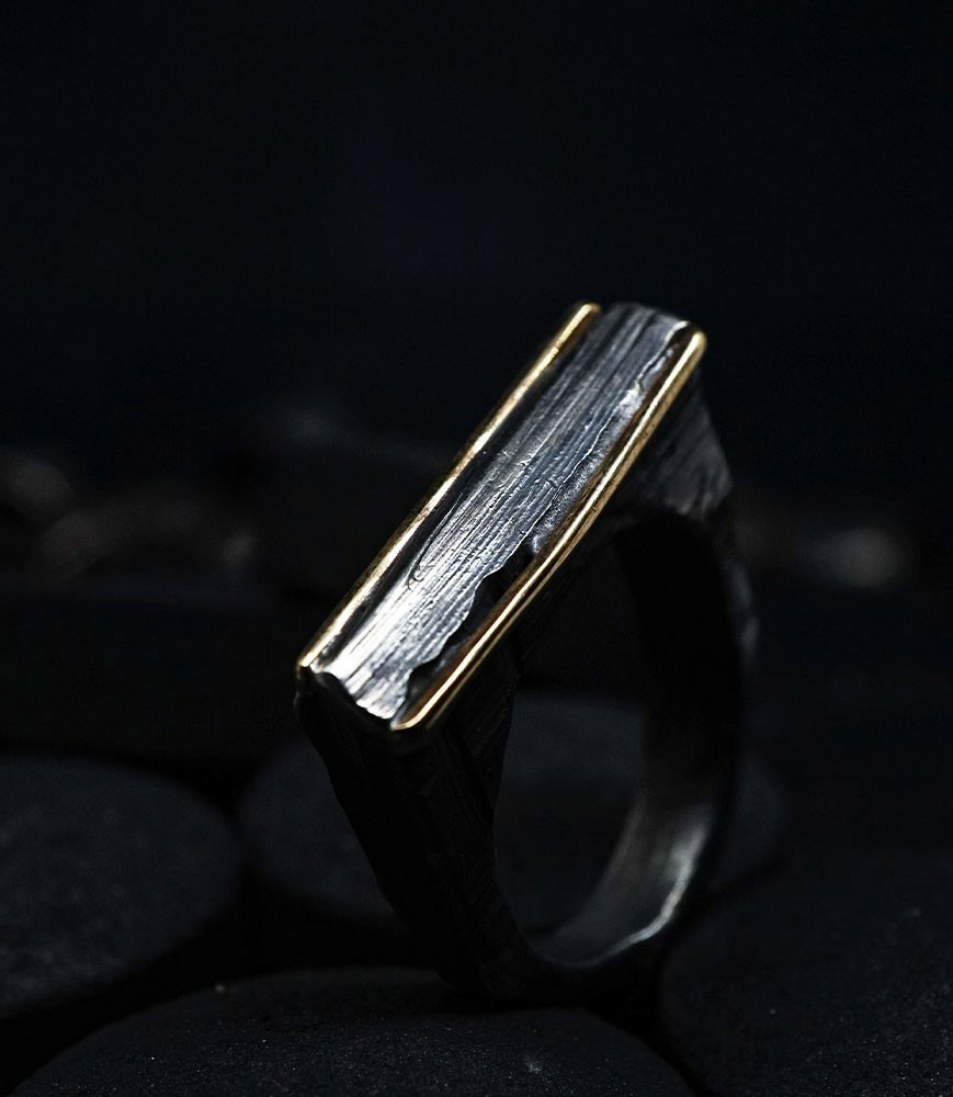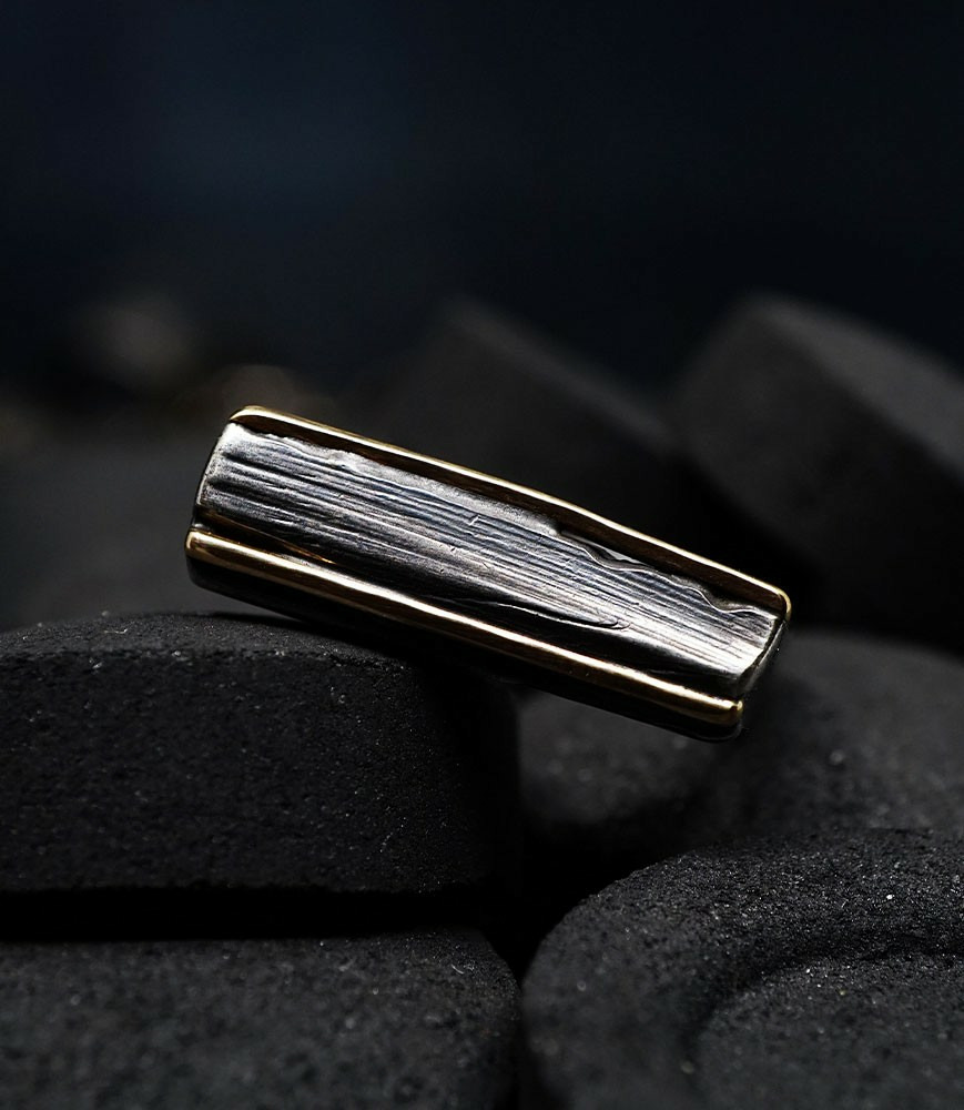 Parfois les stries dans le métal de la bague rappellent la superposition des couches sédimentaires géologiques que l'on peut observer dans les roches. D'autres bijoux en argent 925/1000 et or 750/1000, peuvent se rapprocher du volcanisme et plus précisément l'aspect des roches volcaniques après éruption comme les scories, les métaux semblent avoir fusionnés ou avoir fondus, ou même avoir éclatés, sous l'effet d'une chaleur extrême.