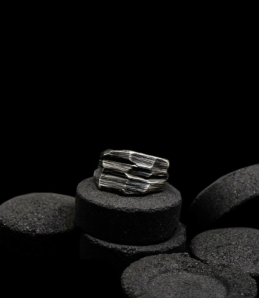 Parfois les stries dans le métal de la bague rappellent la superposition des couches sédimentaires géologiques que l'on peut observer dans les roches. D'autres bijoux en argent 925/1000 et or 750/1000, peuvent se rapprocher du volcanisme et plus précisément l'aspect des roches volcaniques après éruption comme les scories, les métaux semblent avoir fusionnés ou avoir fondus, ou même avoir éclatés, sous l'effet d'une chaleur extrême.