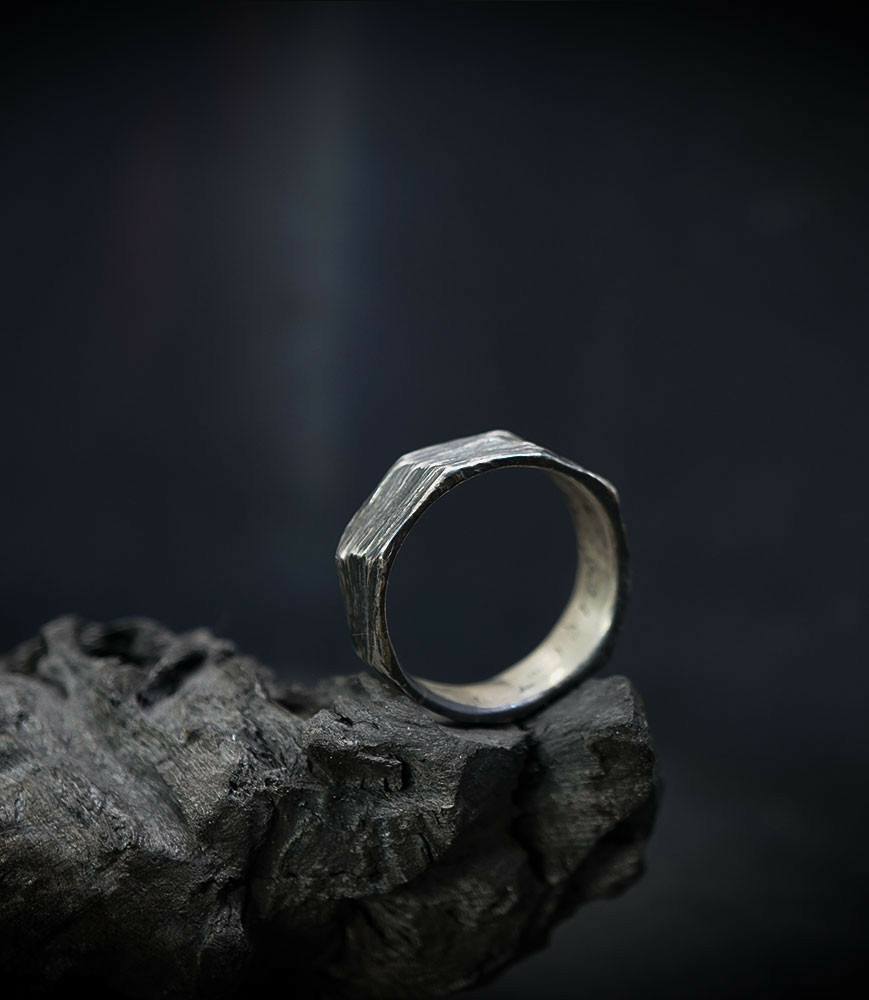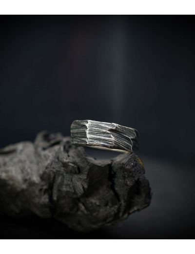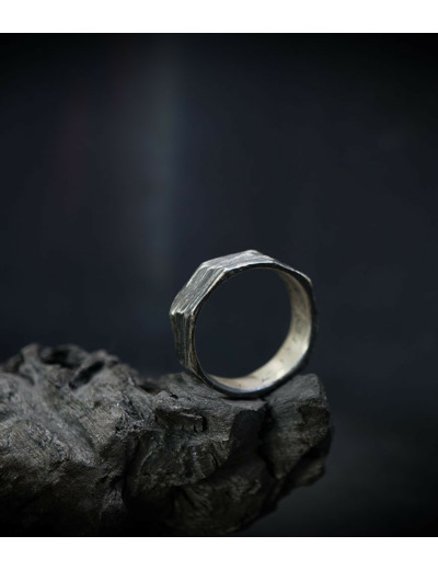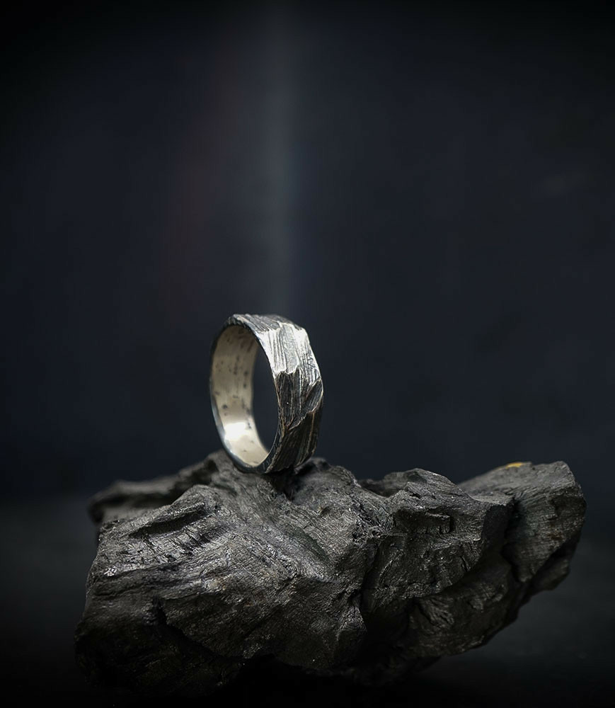 Parfois les stries dans le métal de la bague rappellent la superposition des couches sédimentaires géologiques que l'on peut observer dans les roches. D'autres bijoux en argent 925/1000 et or 750/1000, peuvent se rapprocher du volcanisme et plus précisément l'aspect des roches volcaniques après éruption comme les scories, les métaux semblent avoir fusionnés ou avoir fondus, ou même avoir éclatés, sous l'effet d'une chaleur extrême.