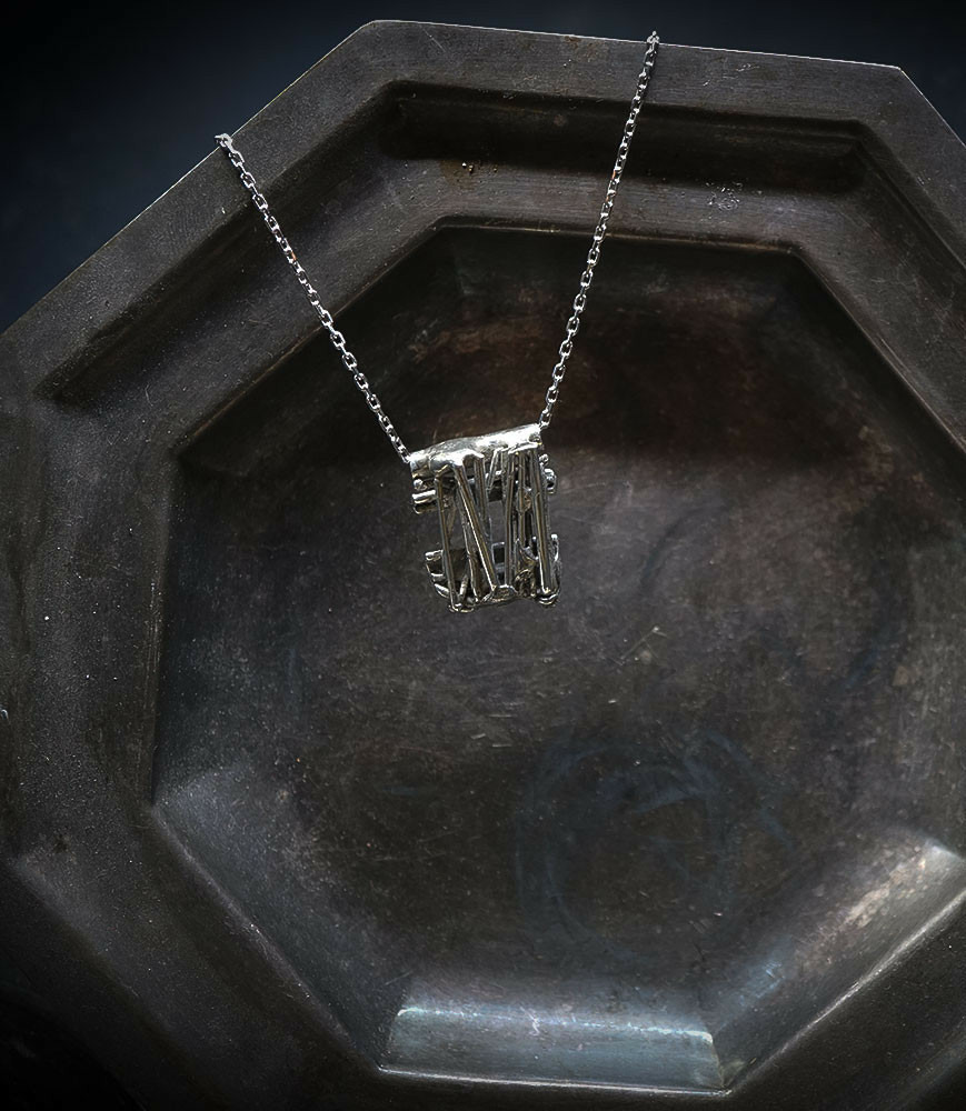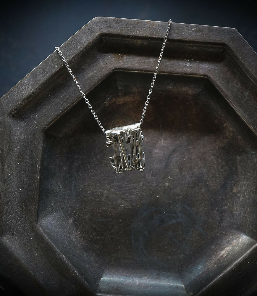 Des pendentifs de la collection Krazy Stones peuvent évoquer la tectoniques des plaques, avec la superposition de différentes pièces d'argent 925/1000 donnant un style géométriques mais asymétriques.