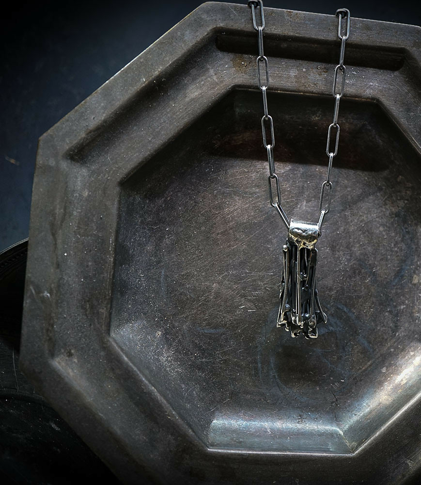 Des pendentifs de la collection Krazy Stones peuvent évoquer la tectoniques des plaques, avec la superposition de différentes pièces d'argent 925/1000 donnant un style géométriques mais asymétriques.