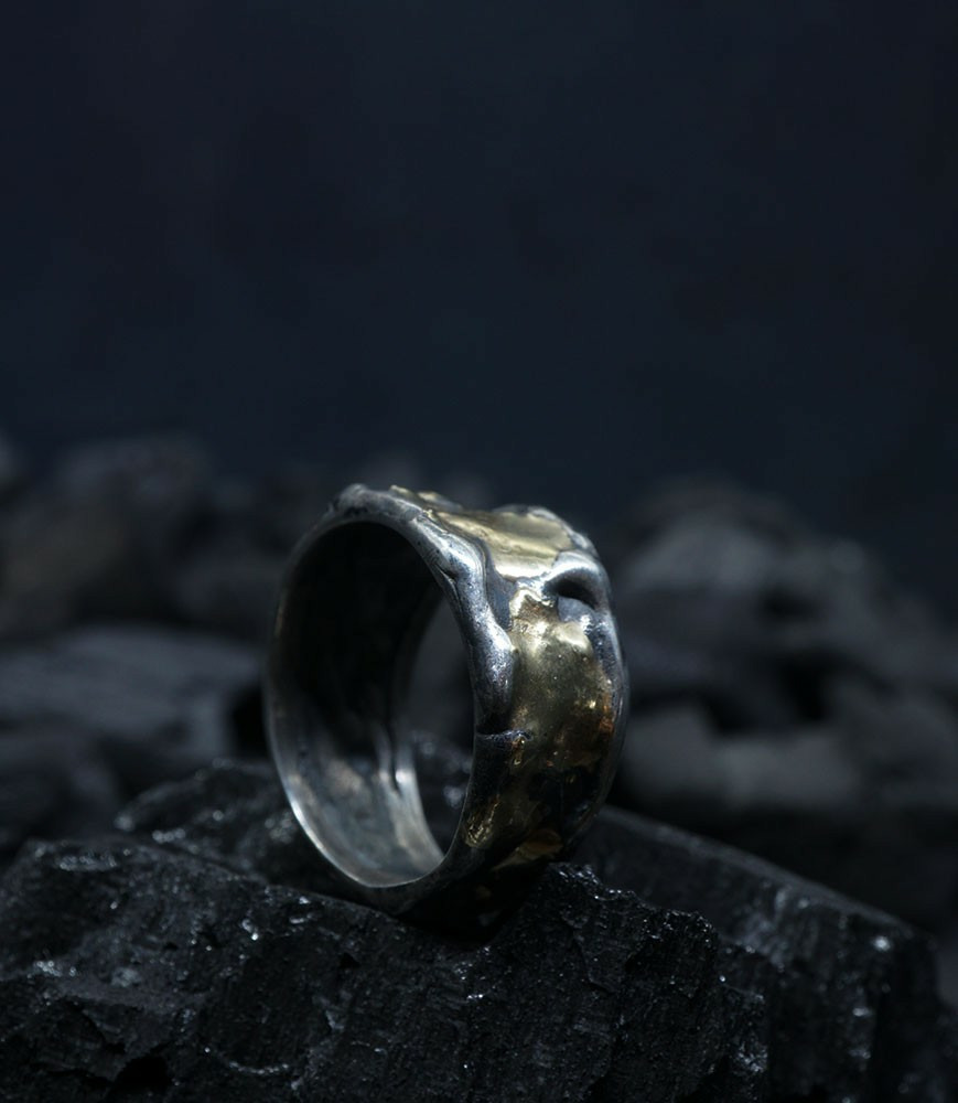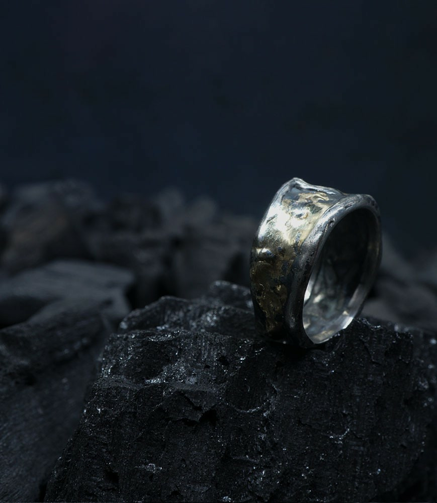 Parfois les stries dans le métal de la bague rappellent la superposition des couches sédimentaires géologiques que l'on peut observer dans les roches. D'autres bijoux en argent 925/1000 et or 750/1000, peuvent se rapprocher du volcanisme et plus précisément l'aspect des roches volcaniques après éruption comme les scories, les métaux semblent avoir fusionnés ou avoir fondus, ou même avoir éclatés, sous l'effet d'une chaleur extrême.