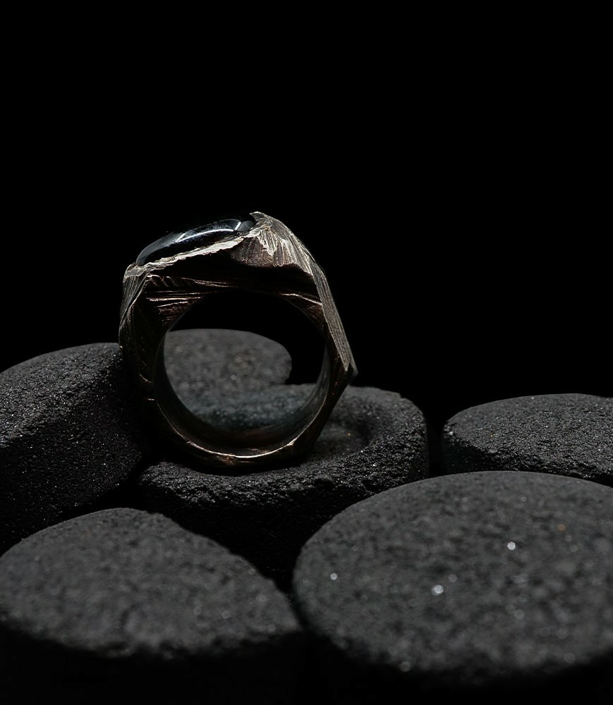 Parfois les stries dans le métal de la bague rappellent la superposition des couches sédimentaires géologiques que l'on peut observer dans les roches. D'autres bijoux en argent 925/1000 et or 750/1000, peuvent se rapprocher du volcanisme et plus précisément l'aspect des roches volcaniques après éruption comme les scories, les métaux semblent avoir fusionnés ou avoir fondus, ou même avoir éclatés, sous l'effet d'une chaleur extrême.