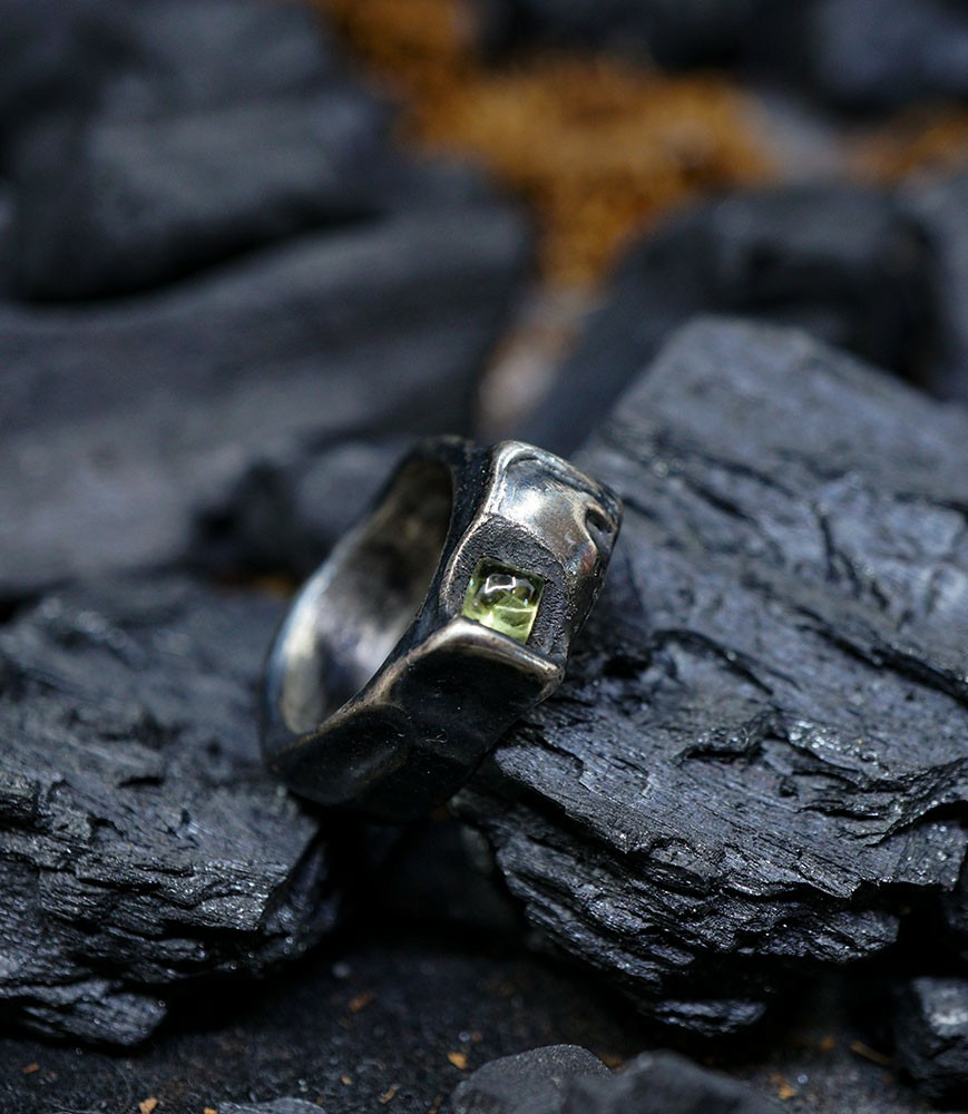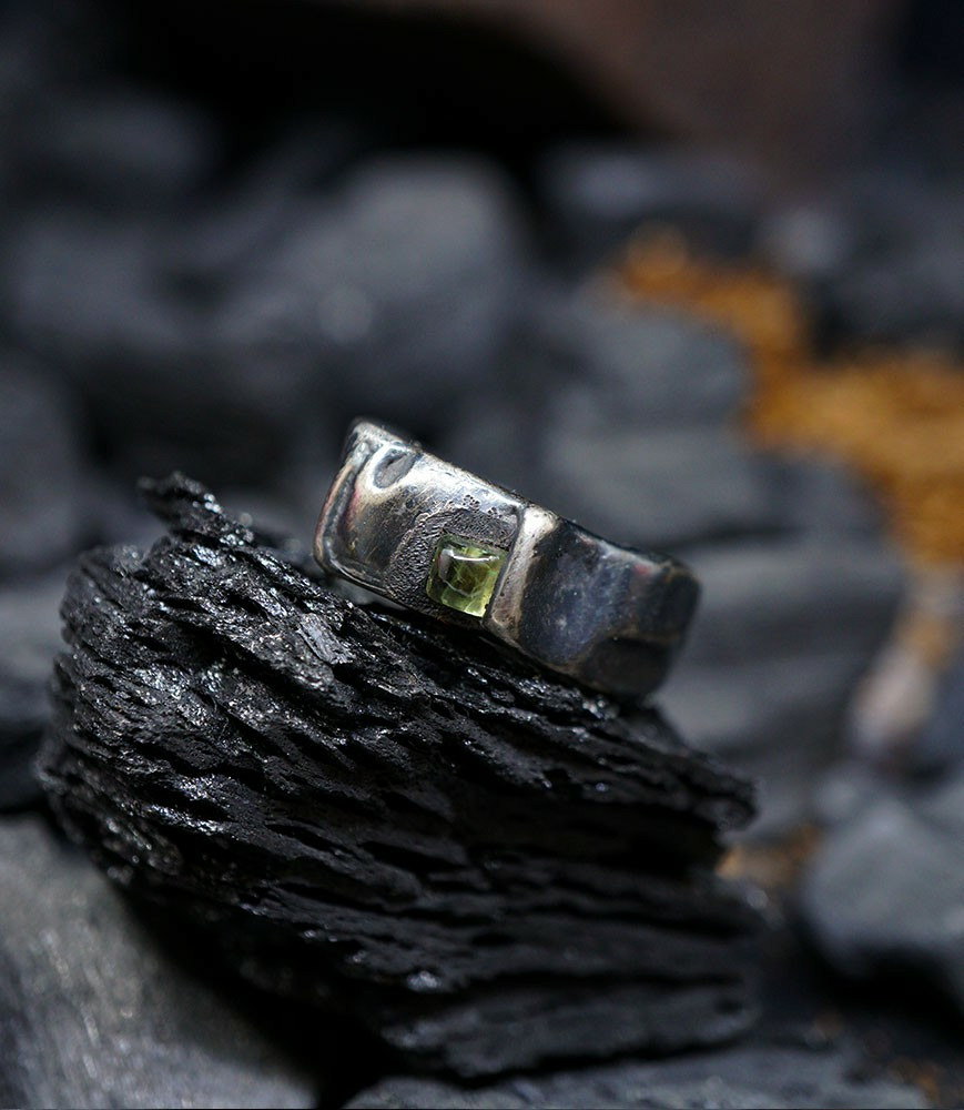 Parfois les stries dans le métal de la bague rappellent la superposition des couches sédimentaires géologiques que l'on peut observer dans les roches. D'autres bijoux en argent 925/1000 et or 750/1000, peuvent se rapprocher du volcanisme et plus précisément l'aspect des roches volcaniques après éruption comme les scories, les métaux semblent avoir fusionnés ou avoir fondus, ou même avoir éclatés, sous l'effet d'une chaleur extrême.