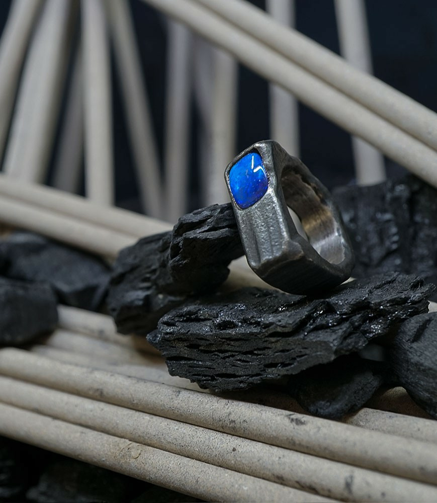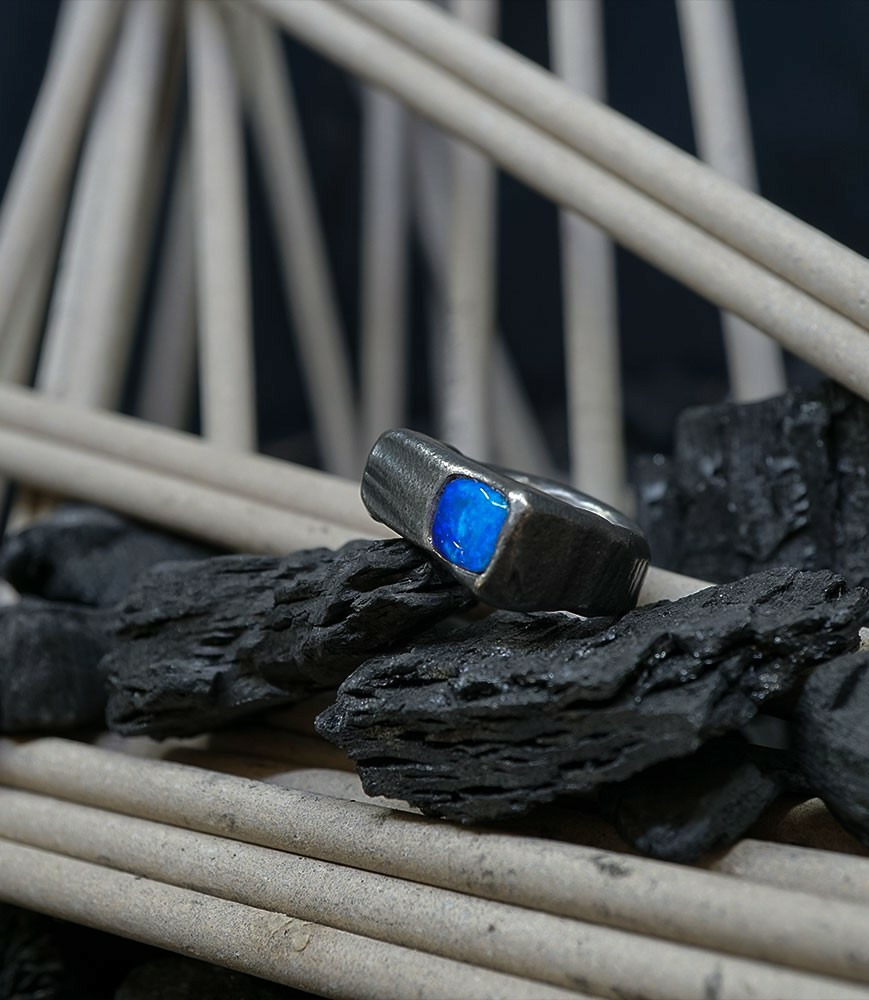 Parfois les stries dans le métal de la bague rappellent la superposition des couches sédimentaires géologiques que l'on peut observer dans les roches. D'autres bijoux en argent 925/1000 et or 750/1000, peuvent se rapprocher du volcanisme et plus précisément l'aspect des roches volcaniques après éruption comme les scories, les métaux semblent avoir fusionnés ou avoir fondus, ou même avoir éclatés, sous l'effet d'une chaleur extrême.