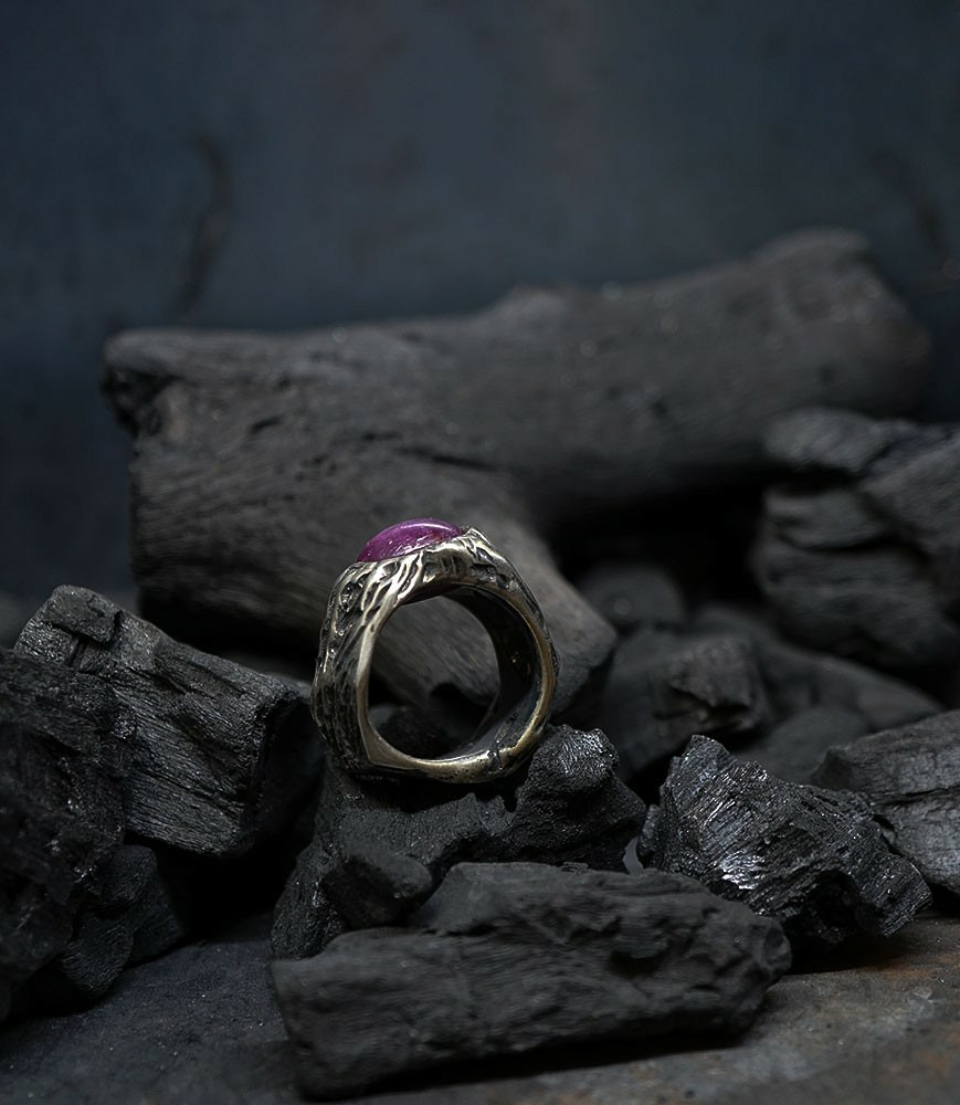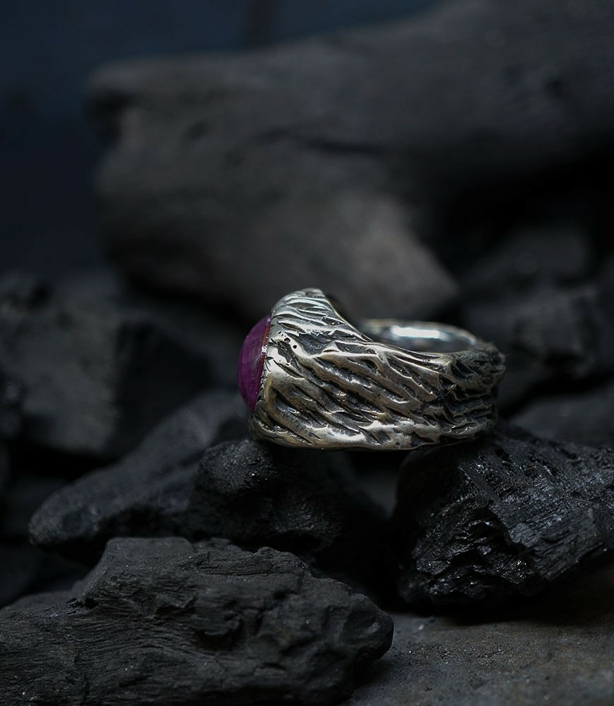 Parfois les stries dans le métal de la bague rappellent la superposition des couches sédimentaires géologiques que l'on peut observer dans les roches. D'autres bijoux en argent 925/1000 et or 750/1000, peuvent se rapprocher du volcanisme et plus précisément l'aspect des roches volcaniques après éruption comme les scories, les métaux semblent avoir fusionnés ou avoir fondus, ou même avoir éclatés, sous l'effet d'une chaleur extrême.