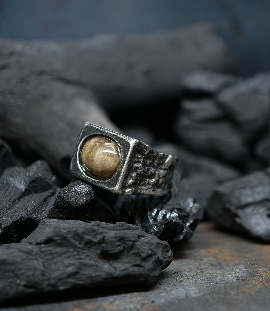 Parfois les stries dans le métal de la bague rappellent la superposition des couches sédimentaires géologiques que l'on peut observer dans les roches. D'autres bijoux en argent 925/1000 et or 750/1000, peuvent se rapprocher du volcanisme et plus précisément l'aspect des roches volcaniques après éruption comme les scories, les métaux semblent avoir fusionnés ou avoir fondus, ou même avoir éclatés, sous l'effet d'une chaleur extrême.