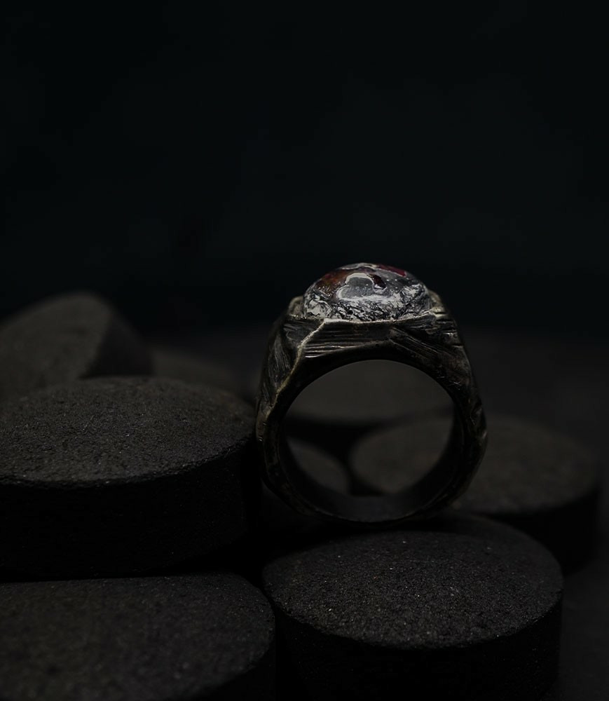 Parfois les stries dans le métal de la bague rappellent la superposition des couches sédimentaires géologiques que l'on peut observer dans les roches. D'autres bijoux en argent 925/1000 et or 750/1000, peuvent se rapprocher du volcanisme et plus précisément l'aspect des roches volcaniques après éruption comme les scories, les métaux semblent avoir fusionnés ou avoir fondus, ou même avoir éclatés, sous l'effet d'une chaleur extrême.