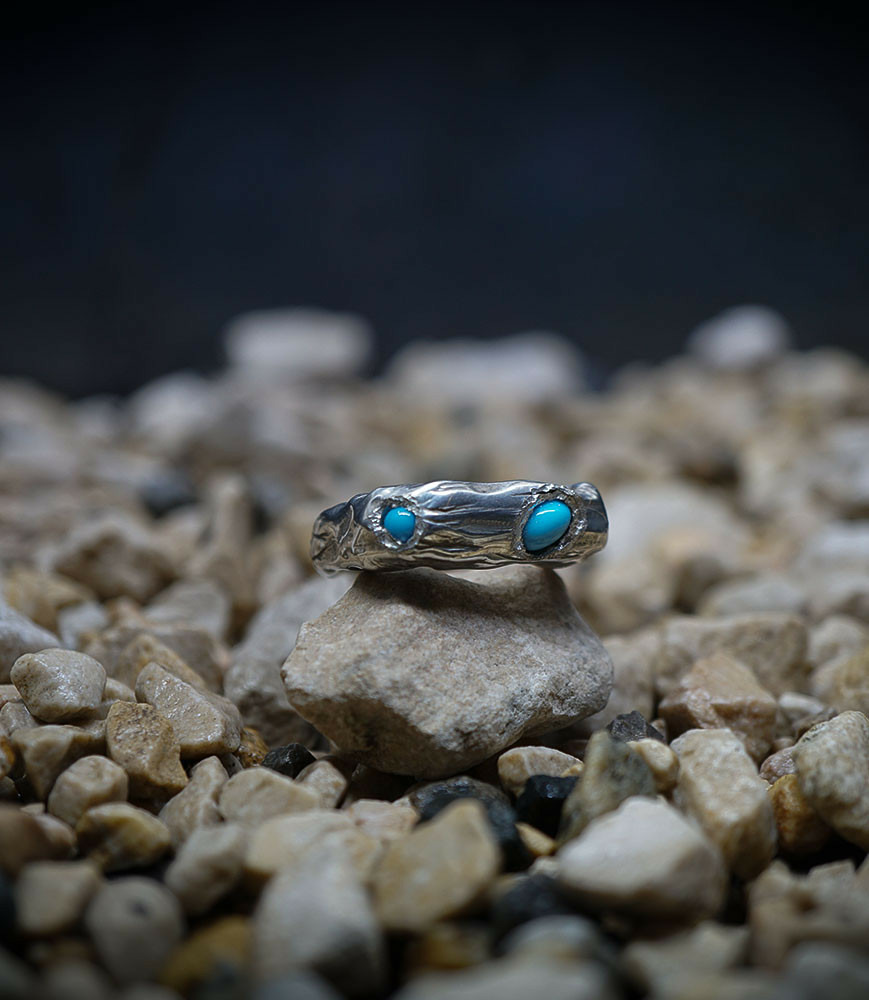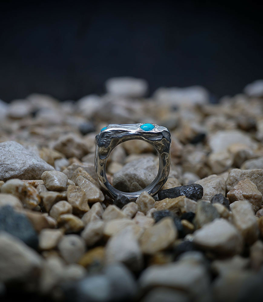 Parfois les stries dans le métal de la bague rappellent la superposition des couches sédimentaires géologiques que l'on peut observer dans les roches. D'autres bijoux en argent 925/1000 et or 750/1000, peuvent se rapprocher du volcanisme et plus précisément l'aspect des roches volcaniques après éruption comme les scories, les métaux semblent avoir fusionnés ou avoir fondus, ou même avoir éclatés, sous l'effet d'une chaleur extrême.