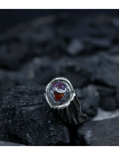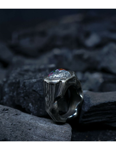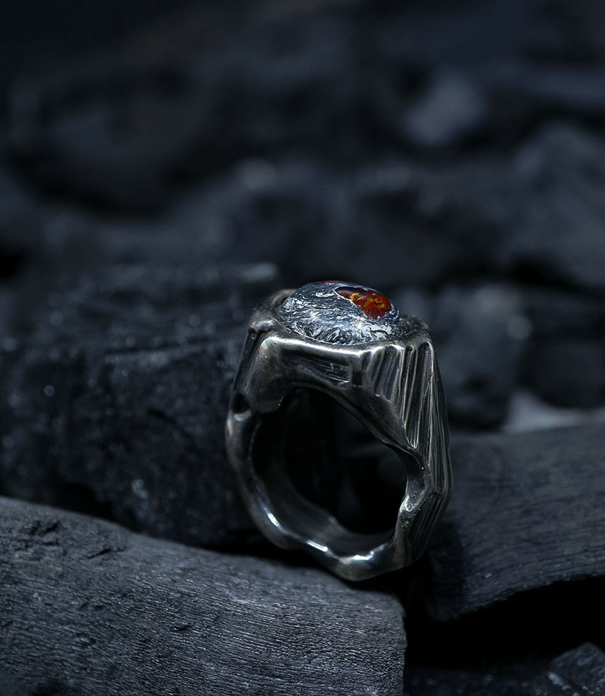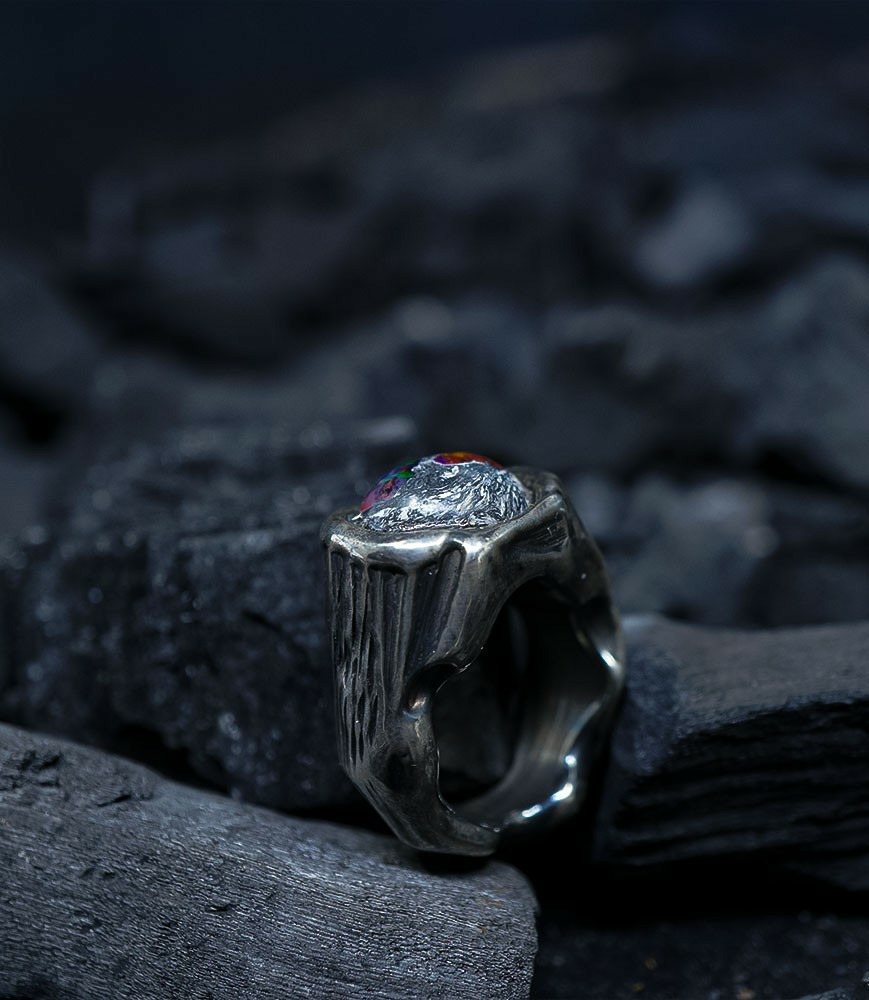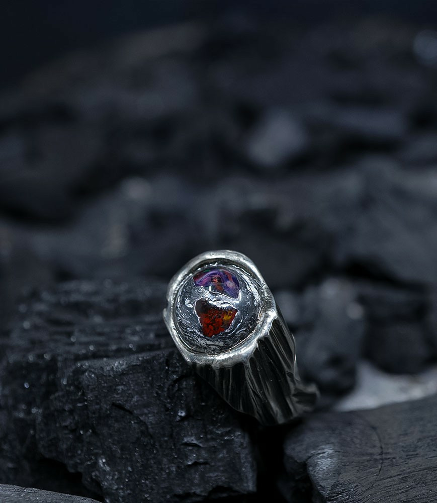Parfois les stries dans le métal de la bague rappellent la superposition des couches sédimentaires géologiques que l'on peut observer dans les roches. D'autres bijoux en argent 925/1000 et or 750/1000, peuvent se rapprocher du volcanisme et plus précisément l'aspect des roches volcaniques après éruption comme les scories, les métaux semblent avoir fusionnés ou avoir fondus, ou même avoir éclatés, sous l'effet d'une chaleur extrême.