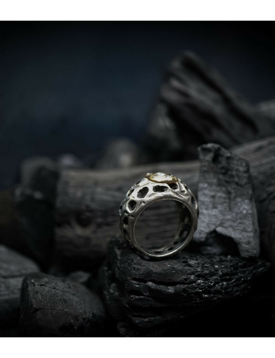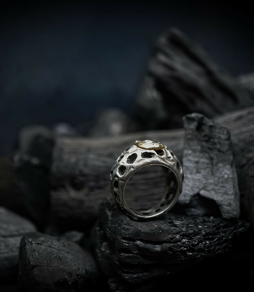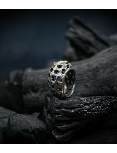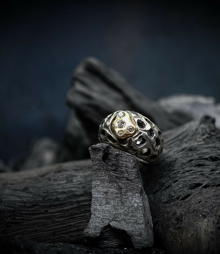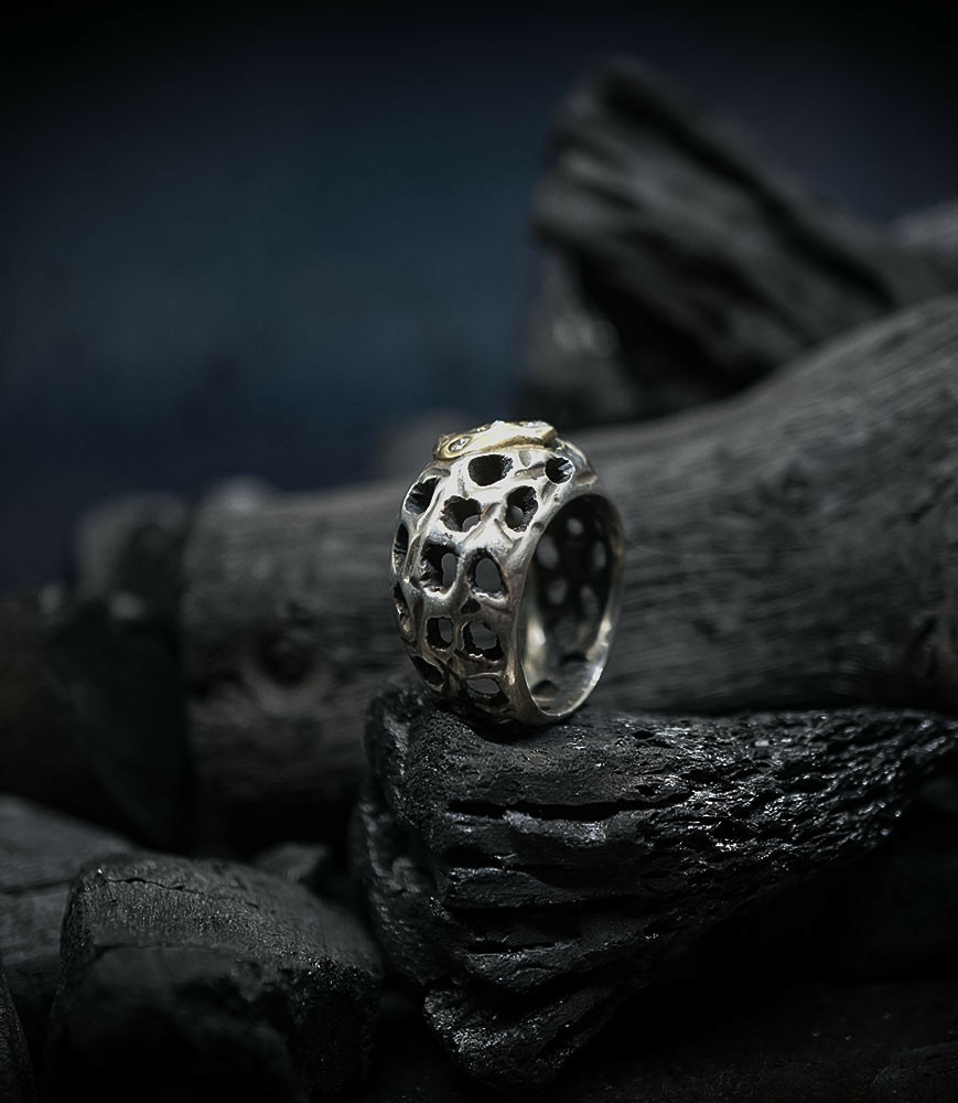 Parfois les stries dans le métal de la bague rappellent la superposition des couches sédimentaires géologiques que l'on peut observer dans les roches. D'autres bijoux en argent 925/1000 et or 750/1000, peuvent se rapprocher du volcanisme et plus précisément l'aspect des roches volcaniques après éruption comme les scories, les métaux semblent avoir fusionnés ou avoir fondus, ou même avoir éclatés, sous l'effet d'une chaleur extrême.