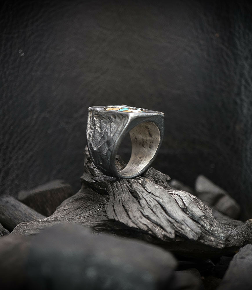 Parfois les stries dans le métal de la bague rappellent la superposition des couches sédimentaires géologiques que l'on peut observer dans les roches. D'autres bijoux en argent 925/1000 et or 750/1000, peuvent se rapprocher du volcanisme et plus précisément l'aspect des roches volcaniques après éruption comme les scories, les métaux semblent avoir fusionnés ou avoir fondus, ou même avoir éclatés, sous l'effet d'une chaleur extrême.
