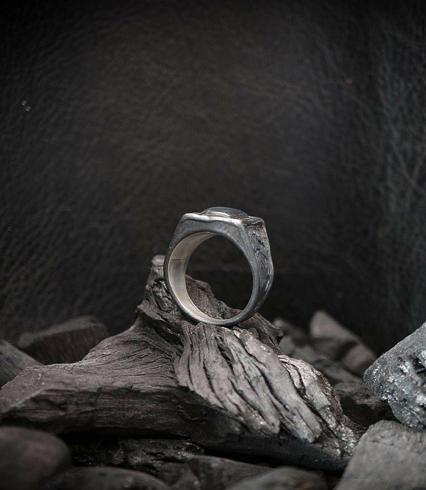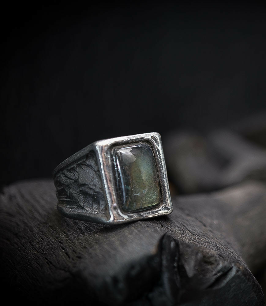 Cette bague offre un contraste fascinant entre l'aspect terrestre et patiné de l'argent brut vieilli et les irisations mystiques et changeantes de la labradorite.