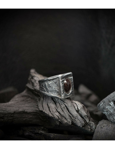 Cette bague présente un caractère à la fois rustique et puissant, grâce à l'association de l'argent brut vieilli et de la pierre œil de taureau.