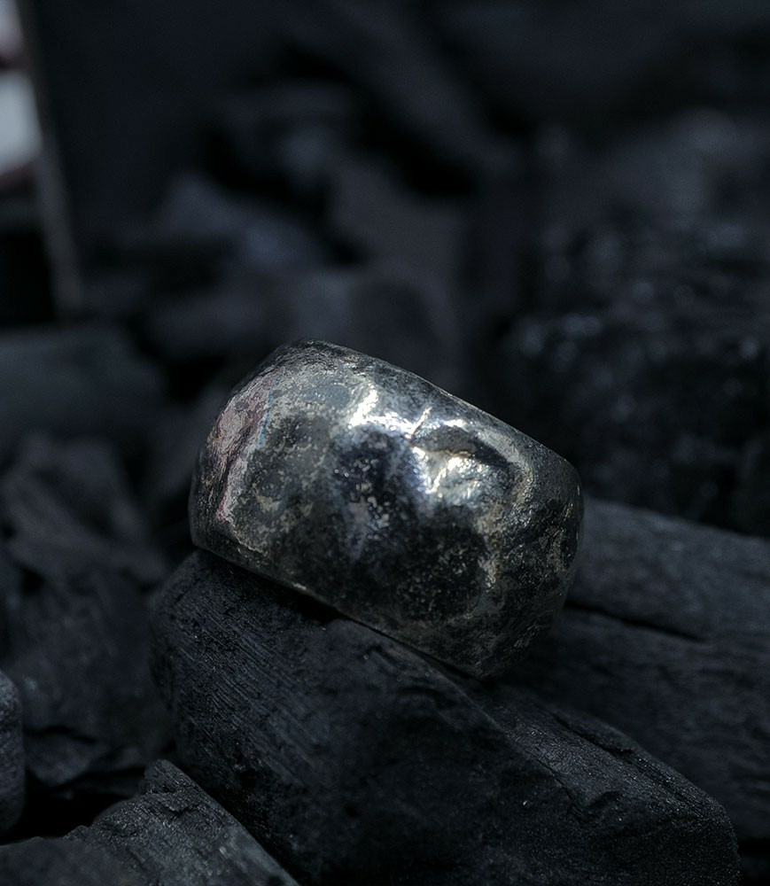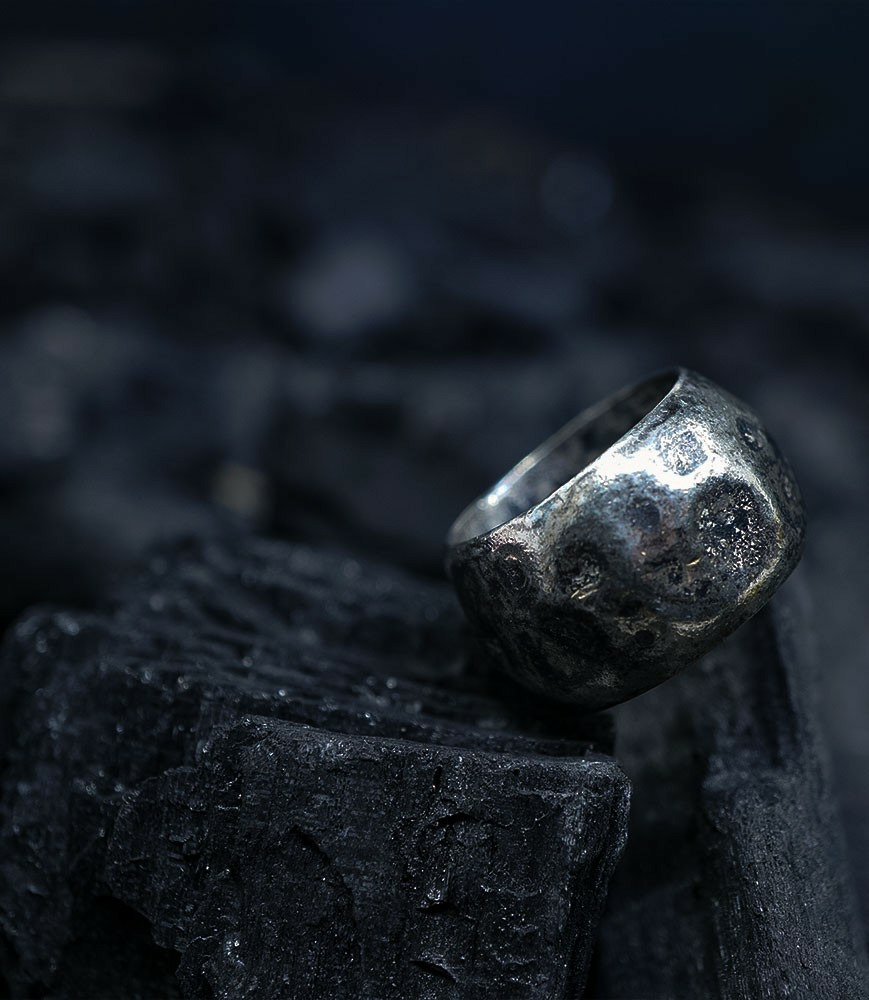 L'argent au titre légal 925/1000 subit un traitement brutal, rude, le résultat après polissage des bagues, bracelets, colliers, bruts, singuliers et harmonieux.