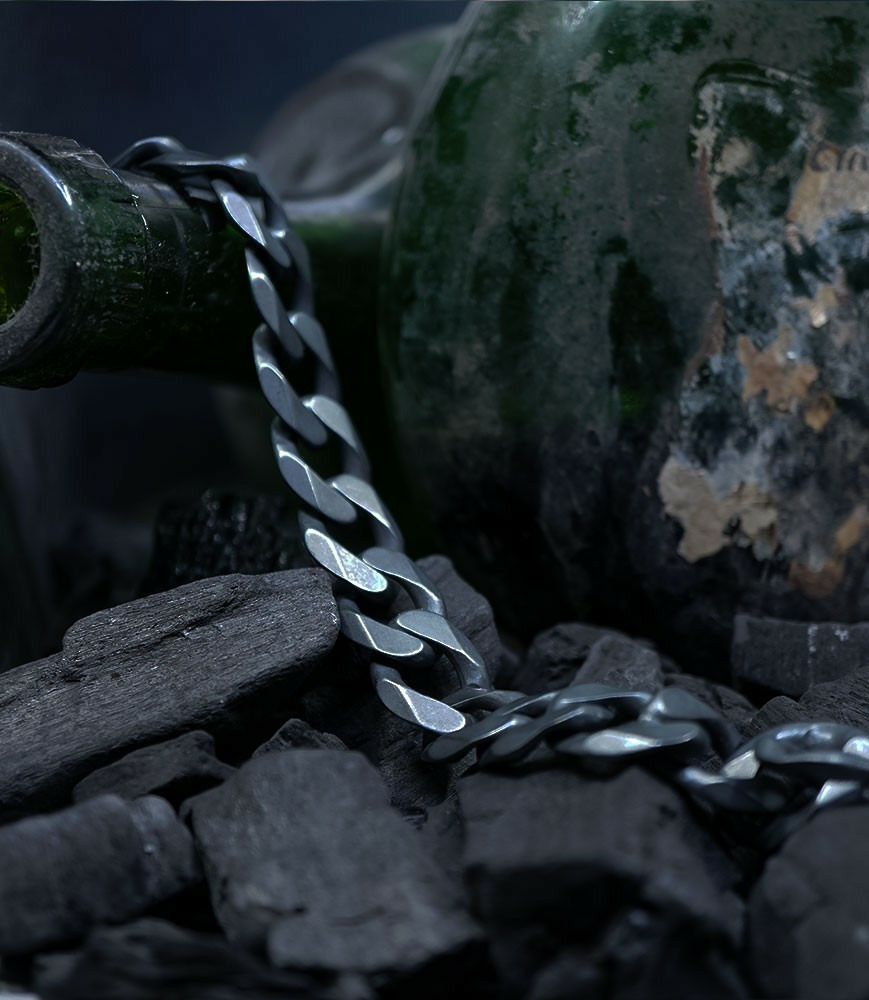L'argent au titre légal 925/1000 subit un traitement brutal, rude, le résultat après polissage des bagues, bracelets, colliers, bruts, singuliers et harmonieux.