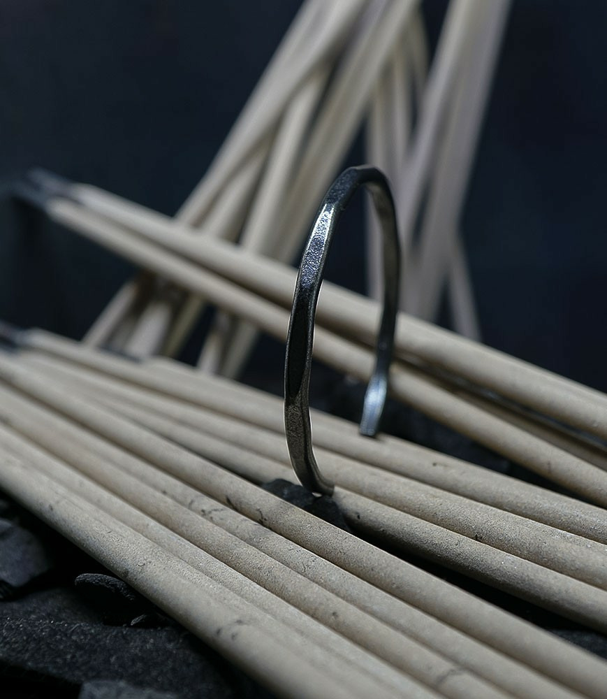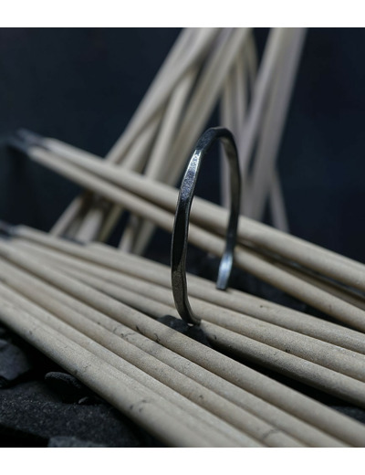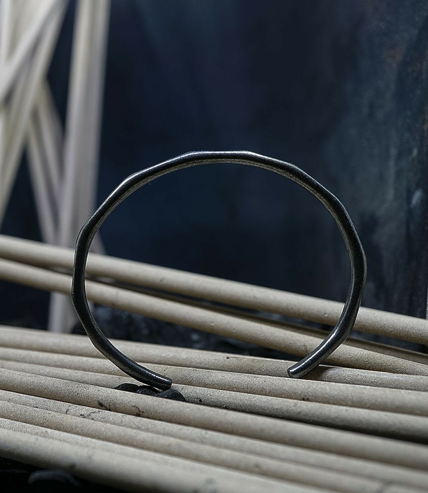 L'argent au titre légal 925/1000 subit un traitement brutal, rude, le résultat après polissage des bagues, bracelets, colliers, bruts, singuliers et harmonieux.