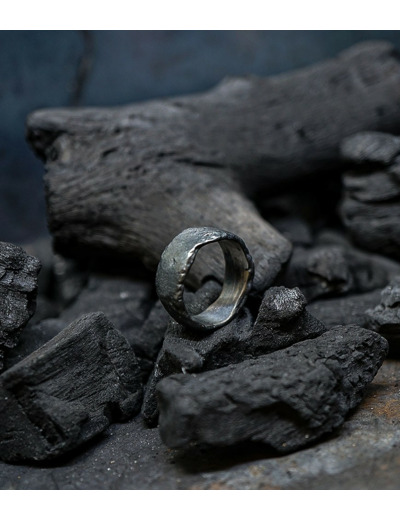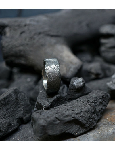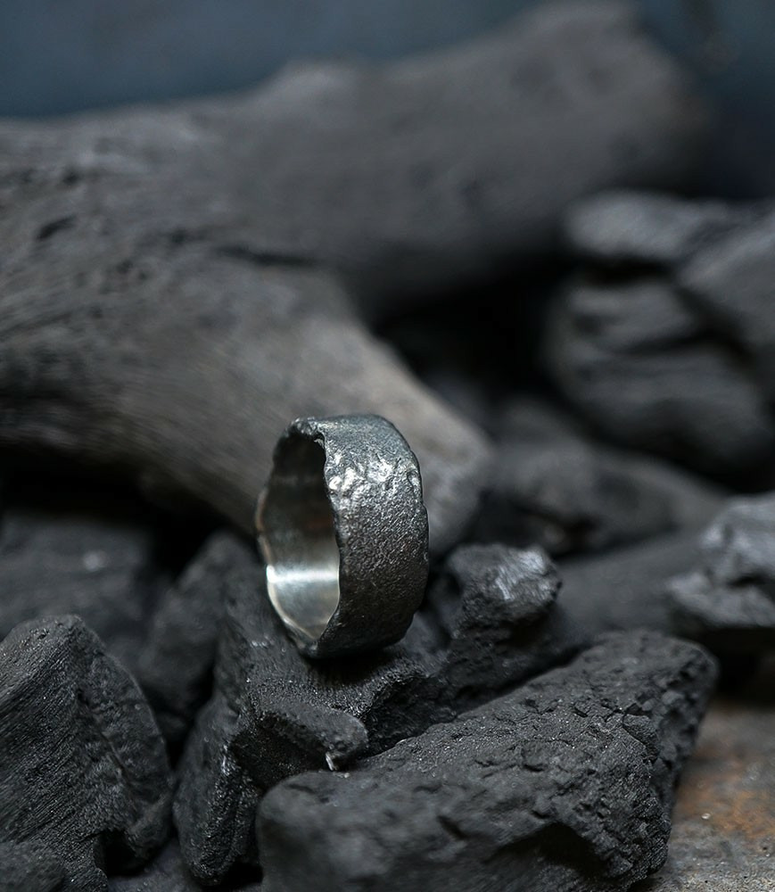 L'argent au titre légal 925/1000 subit un traitement brutal, rude, le résultat après polissage des bagues, bracelets, colliers, bruts, singuliers et harmonieux.