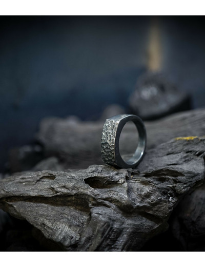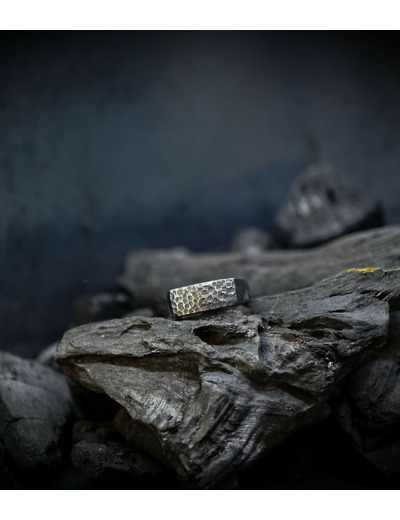 L'argent au titre légal 925/1000 subit un traitement brutal, rude, le résultat après polissage des bagues, bracelets, colliers, bruts, singuliers et harmonieux.