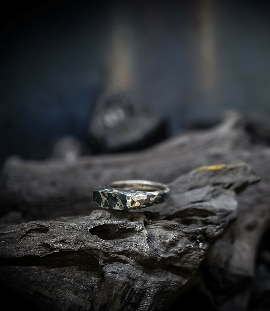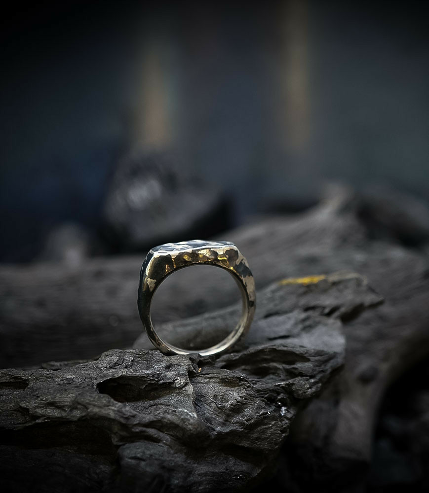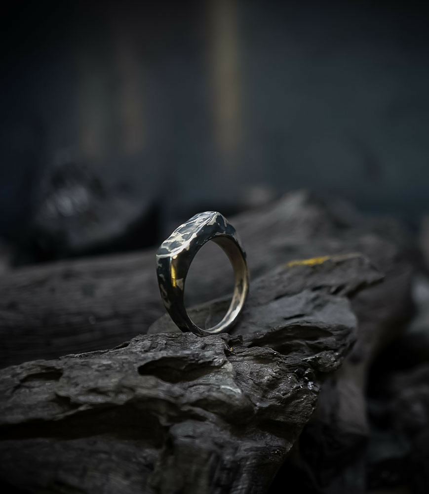 L'argent au titre légal 925/1000 subit un traitement brutal, rude, le résultat après polissage des bagues, bracelets, colliers, bruts, singuliers et harmonieux.