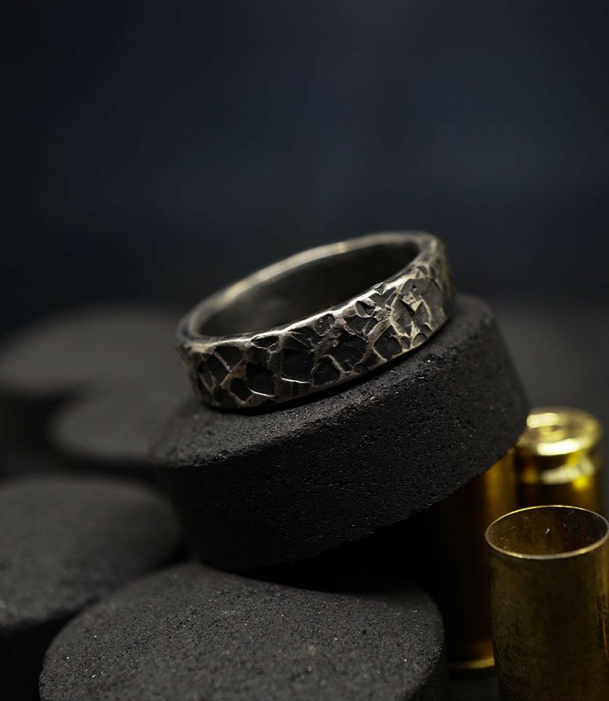 L'argent au titre légal 925/1000 subit un traitement brutal, rude, le résultat après polissage des bagues, bracelets, colliers, bruts, singuliers et harmonieux.