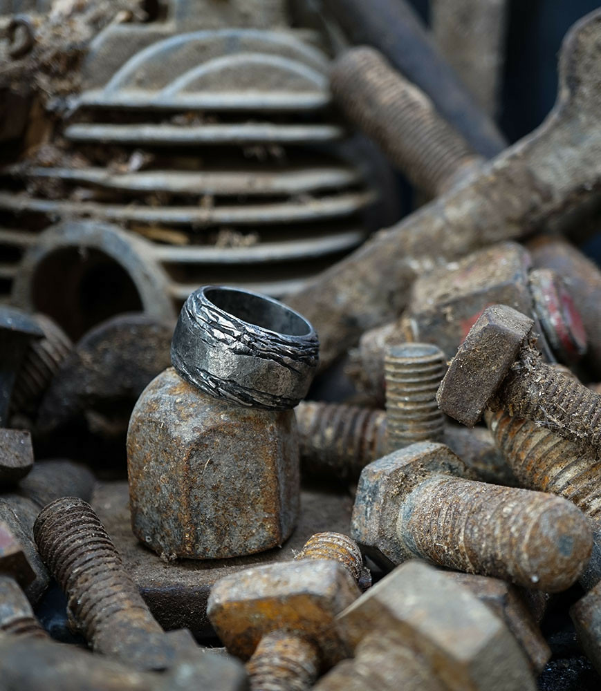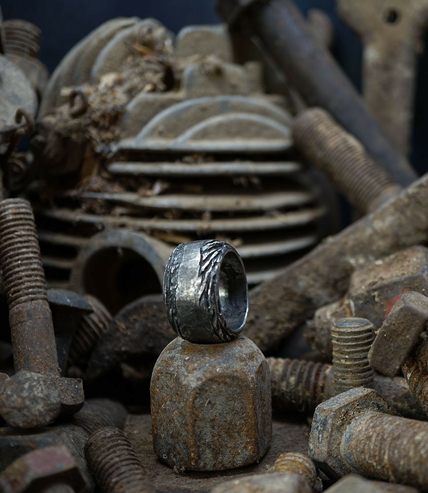 L'argent au titre légal 925/1000 subit un traitement brutal, rude, le résultat après polissage des bagues, bracelets, colliers, bruts, singuliers et harmonieux.