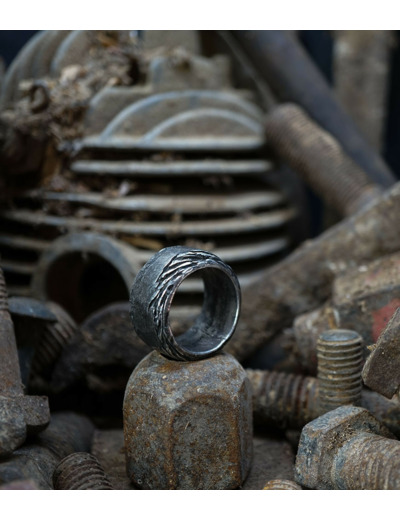Unicité renforcée par la patine noircie appliquée sur l'argent 925/1000 qui s'estompe peu à peu avec le temps. Vivant, le bijou révèlera des zones où l'aspect brillant du métal reprendra ses droits.