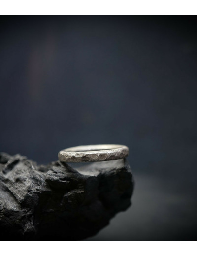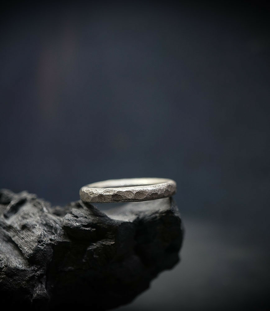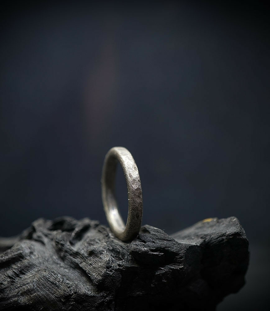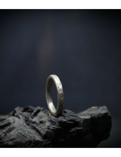 L'argent au titre légal 925/1000 subit un traitement brutal, rude, le résultat après polissage des bagues, bracelets, colliers, bruts, singuliers et harmonieux.