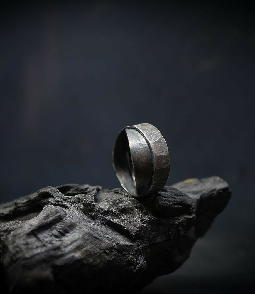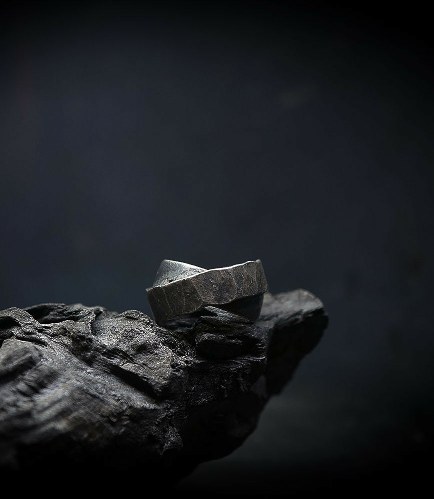L'argent au titre légal 925/1000 subit un traitement brutal, rude, le résultat après polissage des bagues, bracelets, colliers, bruts, singuliers et harmonieux.