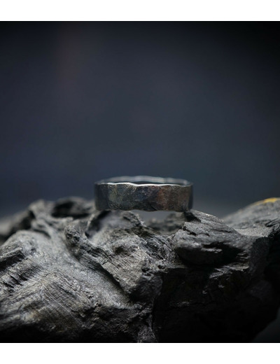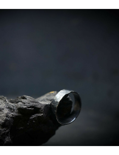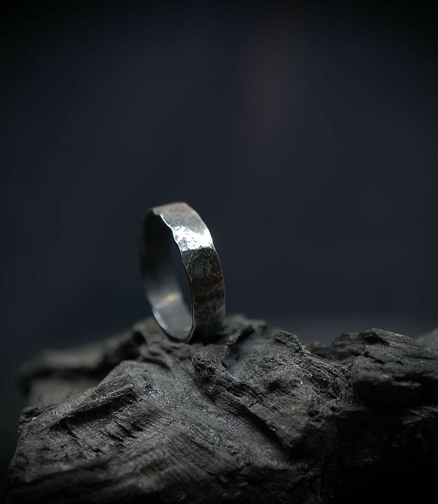 L'argent au titre légal 925/1000 subit un traitement brutal, rude, le résultat après polissage des bagues, bracelets, colliers, bruts, singuliers et harmonieux.
