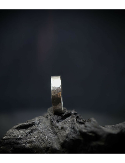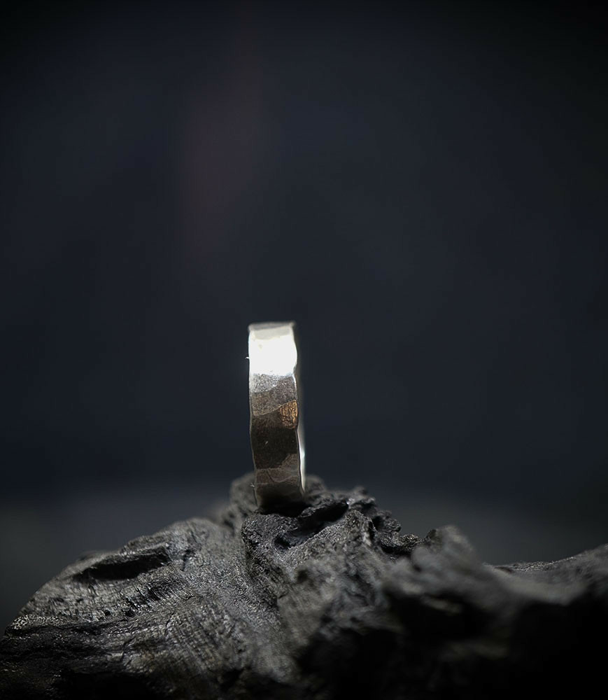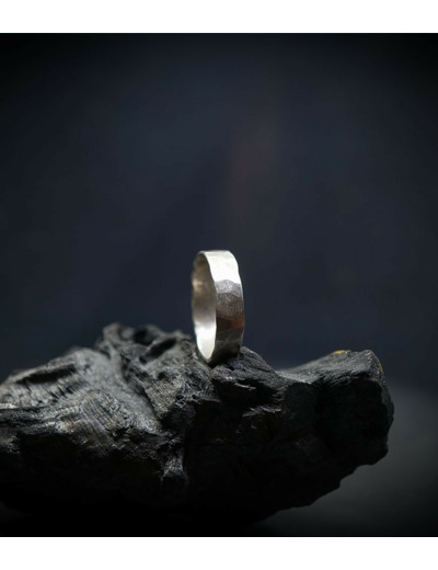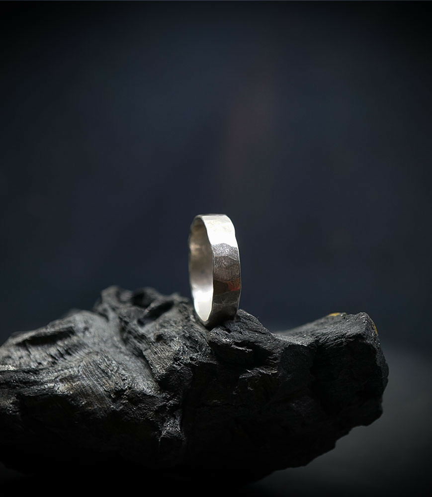L'argent au titre légal 925/1000 subit un traitement brutal, rude, le résultat après polissage des bagues, bracelets, colliers, bruts, singuliers et harmonieux.
