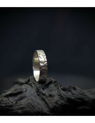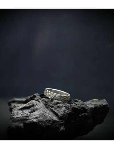 L'argent au titre légal 925/1000 subit un traitement brutal, rude, le résultat après polissage des bagues, bracelets, colliers, bruts, singuliers et harmonieux.