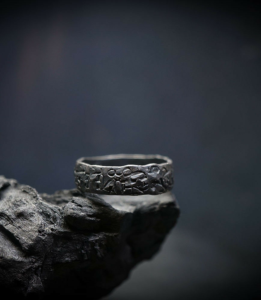 L'argent au titre légal 925/1000 subit un traitement brutal, rude, le résultat après polissage des bagues, bracelets, colliers, bruts, singuliers et harmonieux.