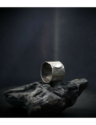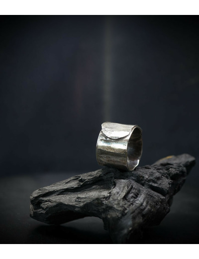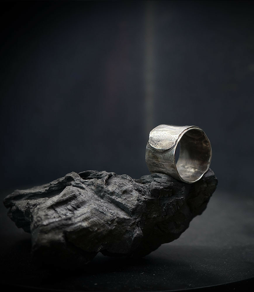 L'argent au titre légal 925/1000 subit un traitement brutal, rude, le résultat après polissage des bagues, bracelets, colliers, bruts, singuliers et harmonieux.