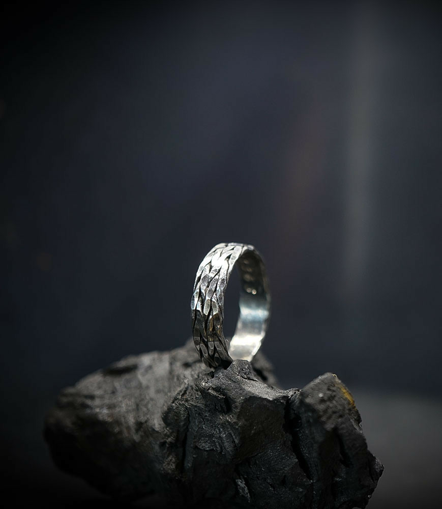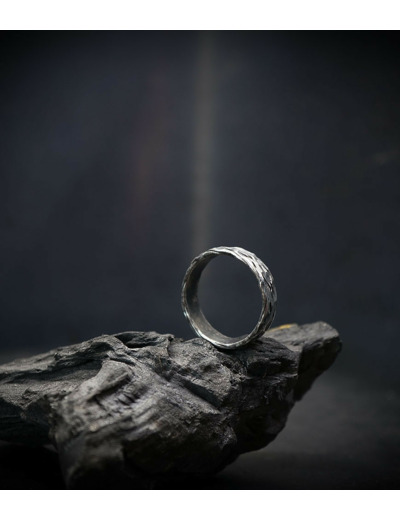 L'argent au titre légal 925/1000 subit un traitement brutal, rude, le résultat après polissage des bagues, bracelets, colliers, bruts, singuliers et harmonieux.