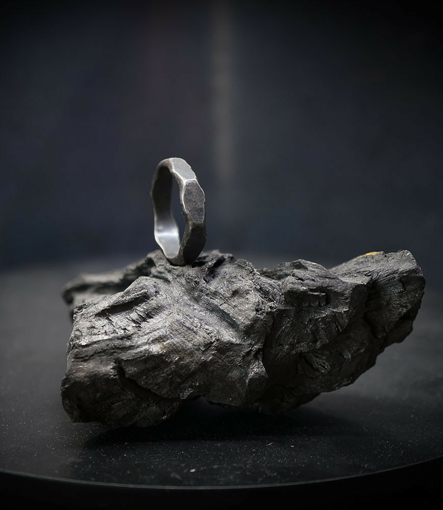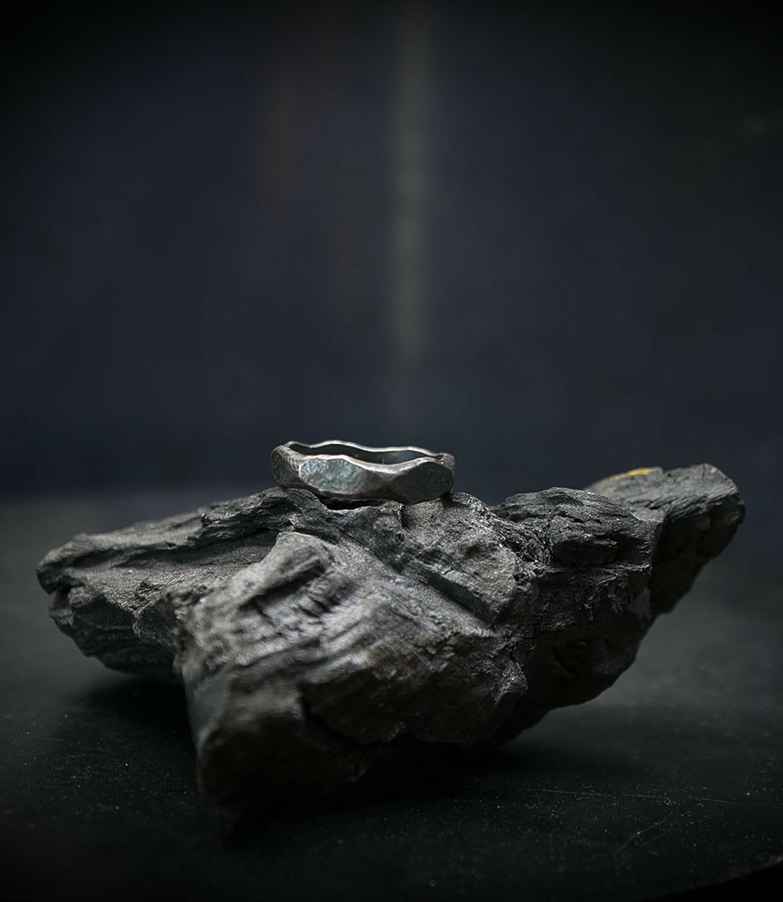L'argent au titre légal 925/1000 subit un traitement brutal, rude, le résultat après polissage des bagues, bracelets, colliers, bruts, singuliers et harmonieux.