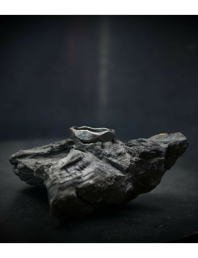 Unicité renforcée par la patine noircie appliquée sur l'argent 925/1000 qui s'estompe peu à peu avec le temps. Vivant, le bijou révèlera des zones où l'aspect brillant du métal reprendra ses droits.