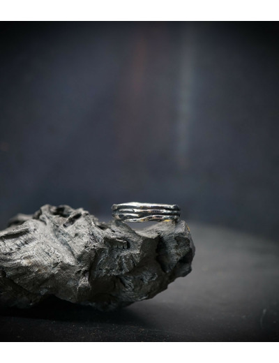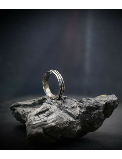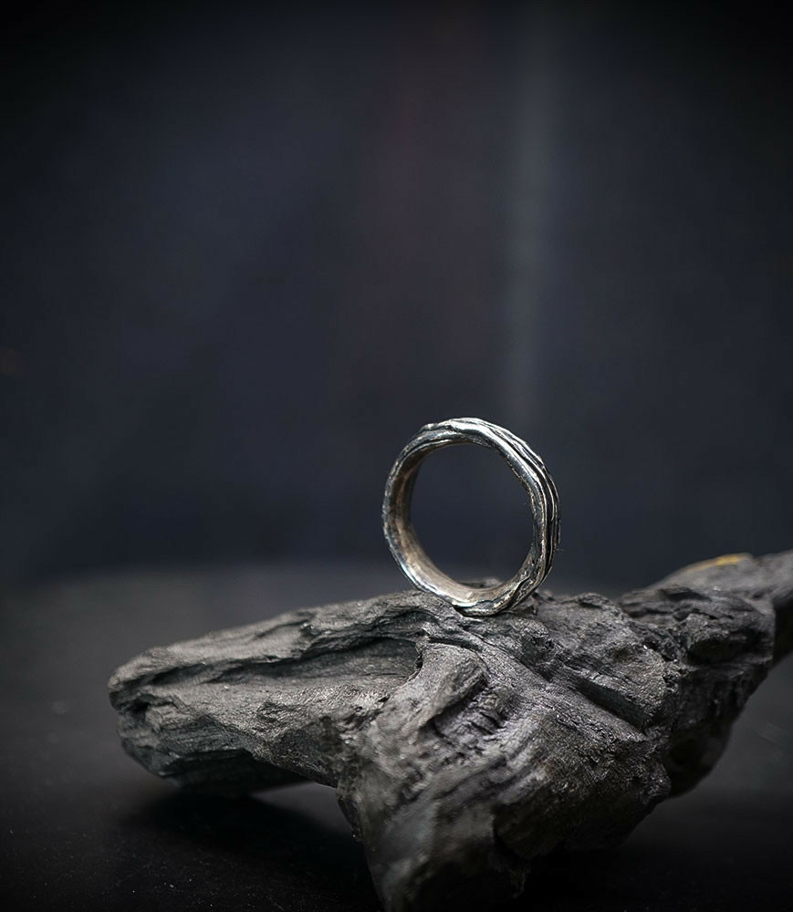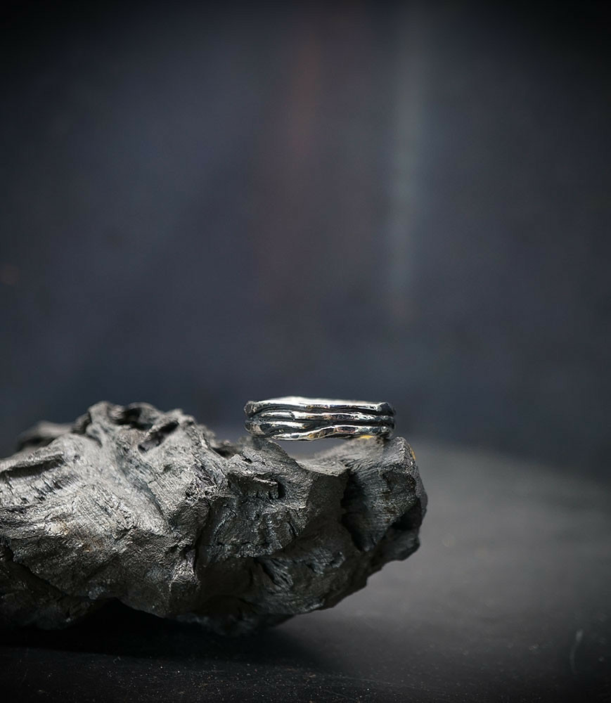 L'argent au titre légal 925/1000 subit un traitement brutal, rude, le résultat après polissage des bagues, bracelets, colliers, bruts, singuliers et harmonieux.