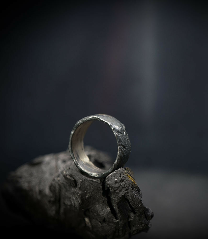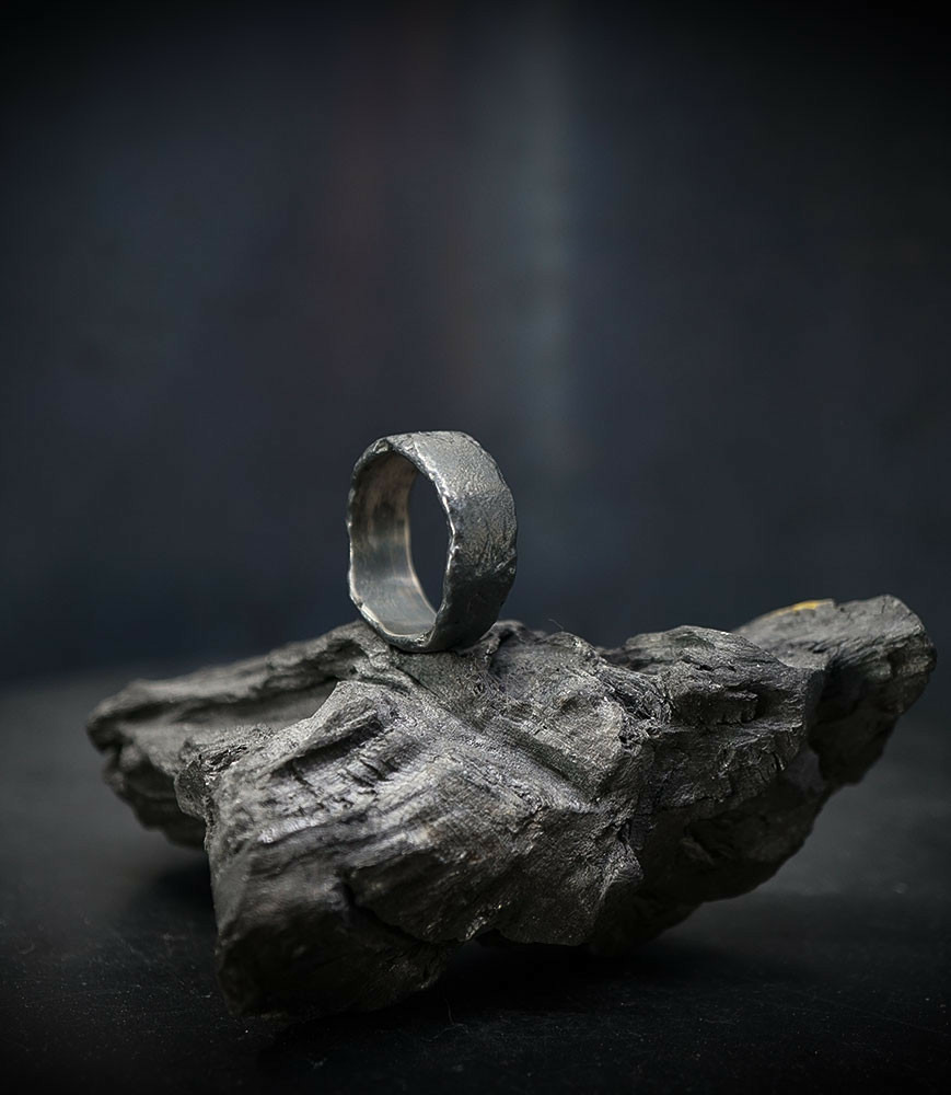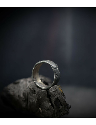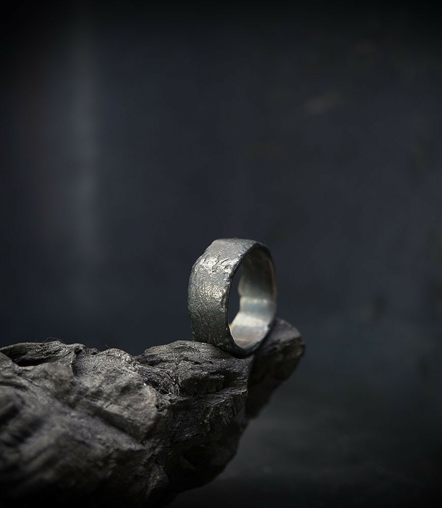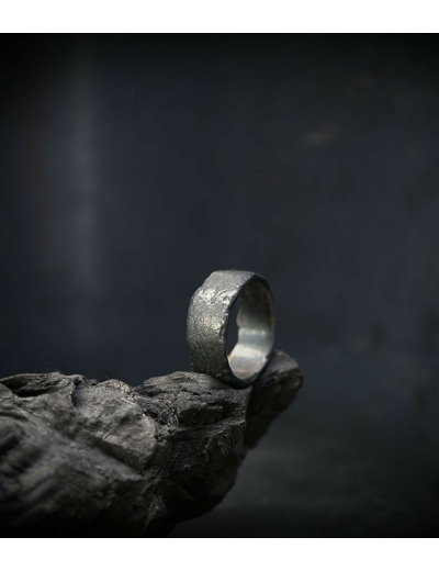 L'argent au titre légal 925/1000 subit un traitement brutal, rude, le résultat après polissage des bagues, bracelets, colliers, bruts, singuliers et harmonieux.