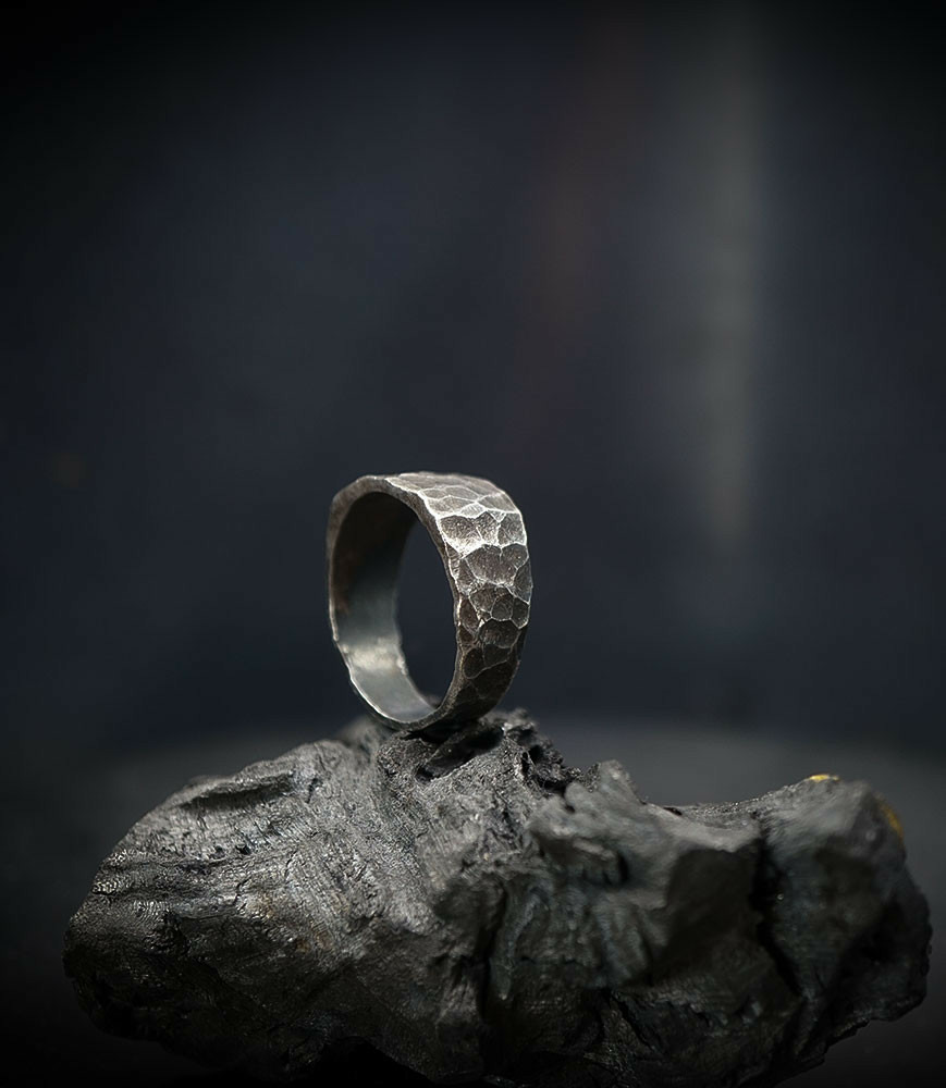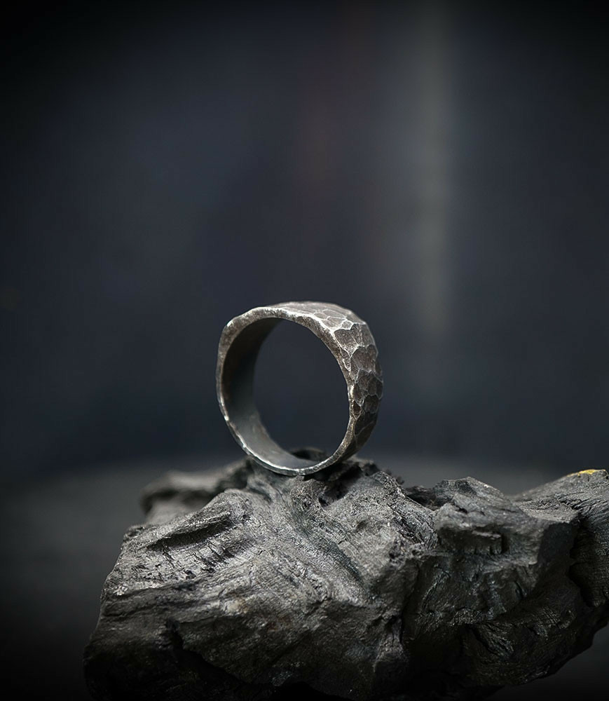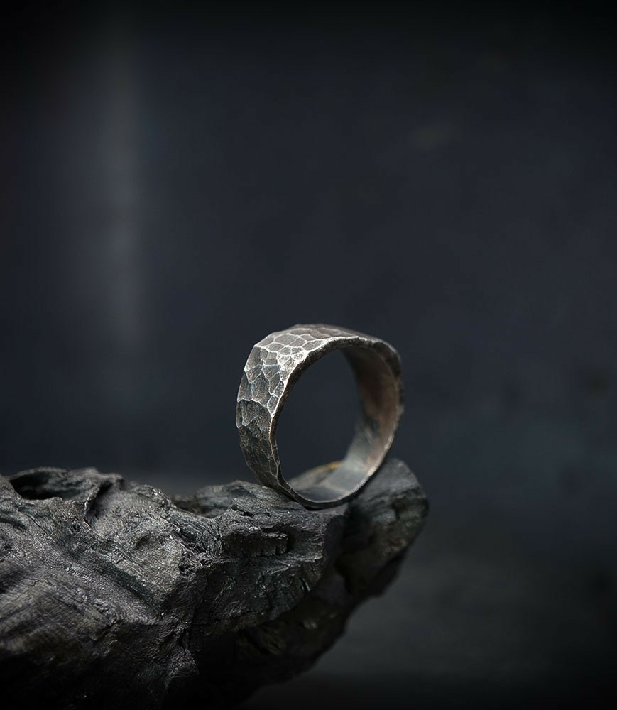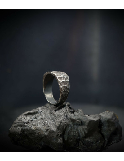 L'argent au titre légal 925/1000 subit un traitement brutal, rude, le résultat après polissage des bagues, bracelets, colliers, bruts, singuliers et harmonieux.