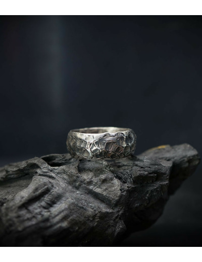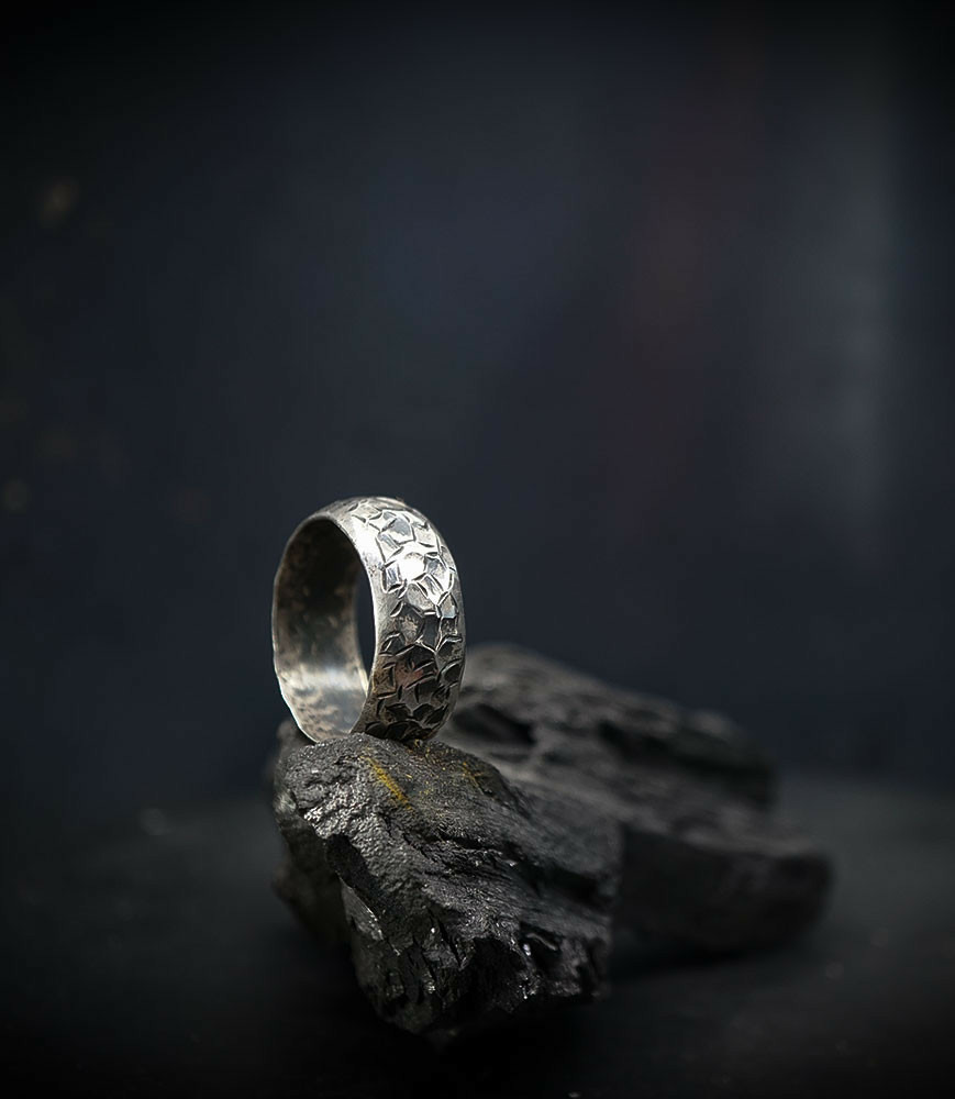 L'argent au titre légal 925/1000 subit un traitement brutal, rude, le résultat après polissage des bagues, bracelets, colliers, bruts, singuliers et harmonieux.