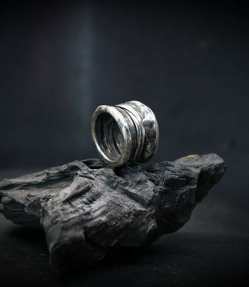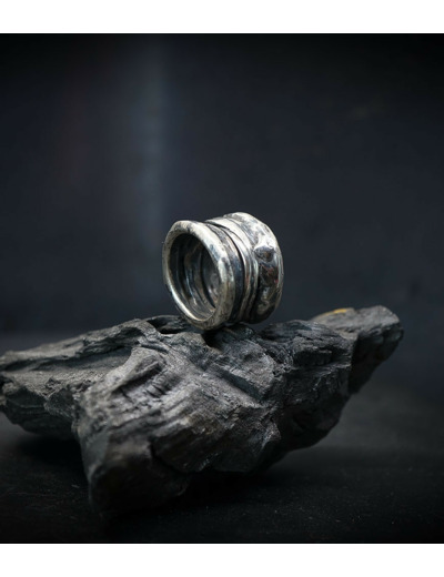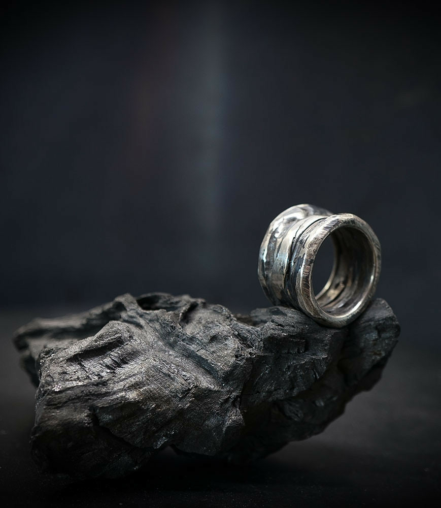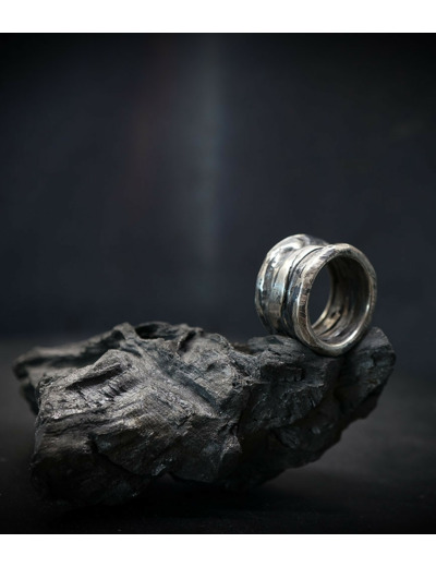 L'argent au titre légal 925/1000 subit un traitement brutal, rude, le résultat après polissage des bagues, bracelets, colliers, bruts, singuliers et harmonieux.