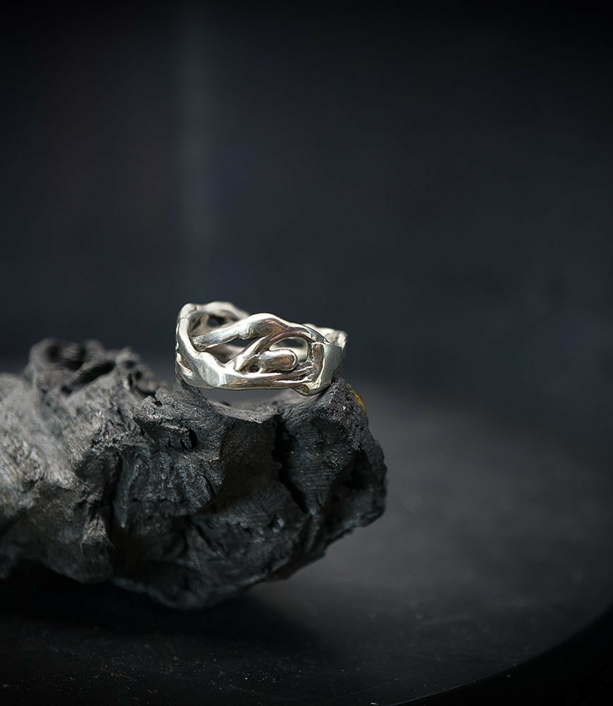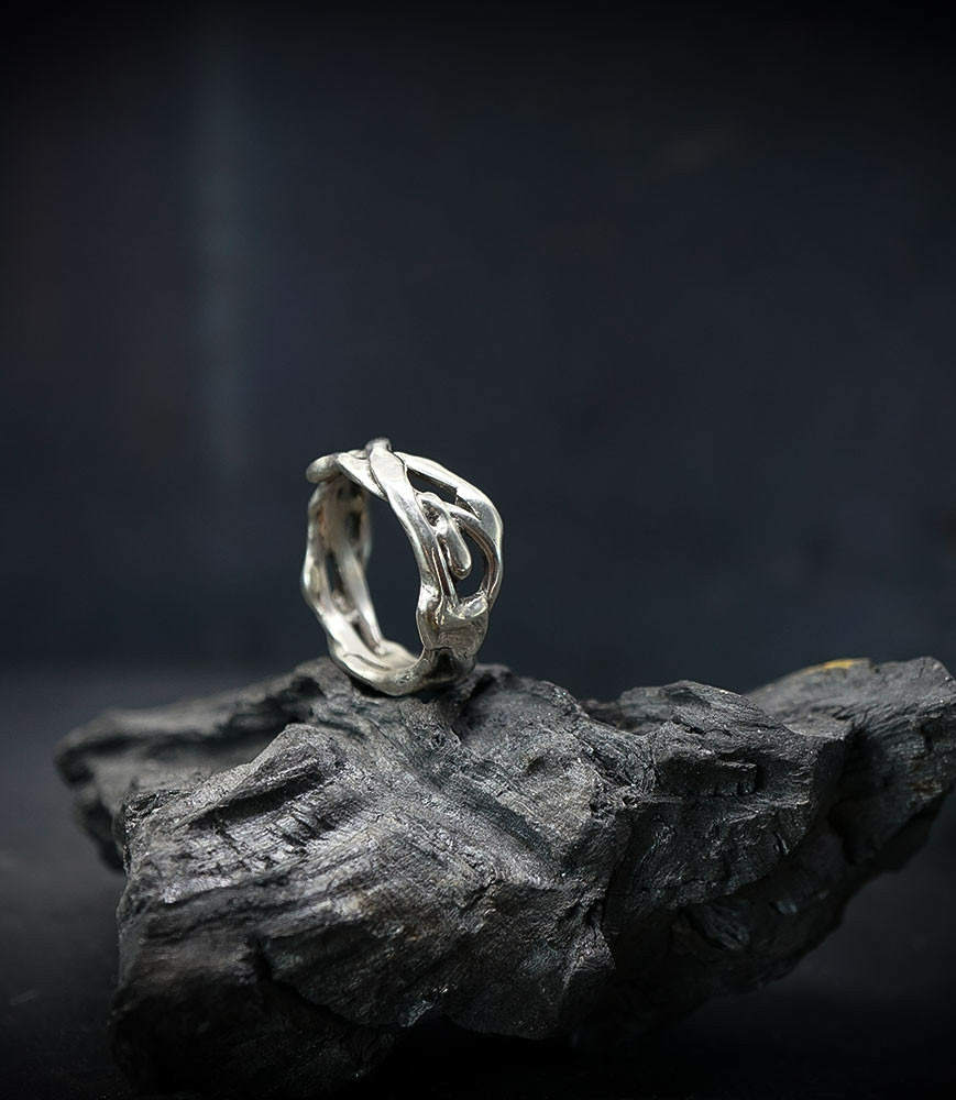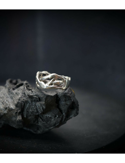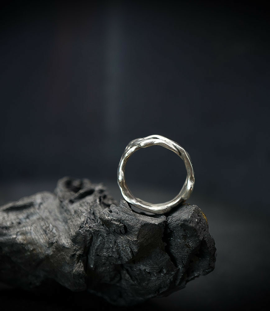L'argent au titre légal 925/1000 subit un traitement brutal, rude, le résultat après polissage des bagues, bracelets, colliers, bruts, singuliers et harmonieux.