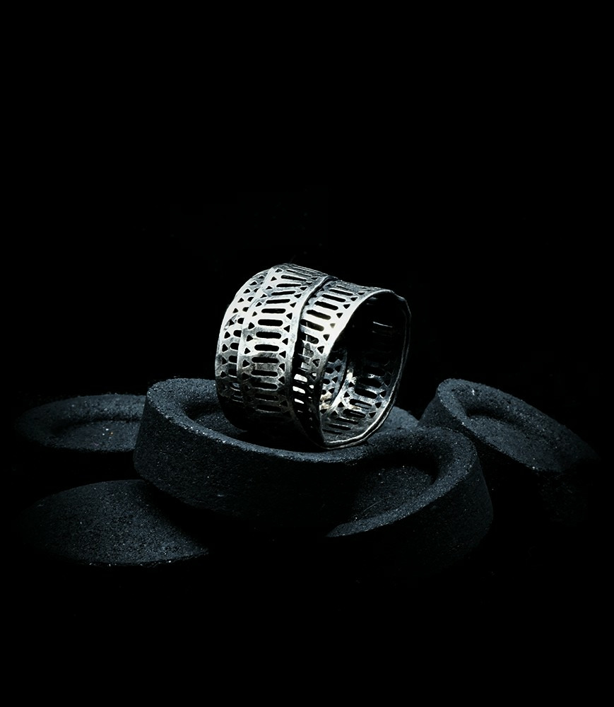 L'argent au titre légal 925/1000 subit un traitement brutal, rude, le résultat après polissage des bagues, bracelets, colliers, bruts, singuliers et harmonieux.