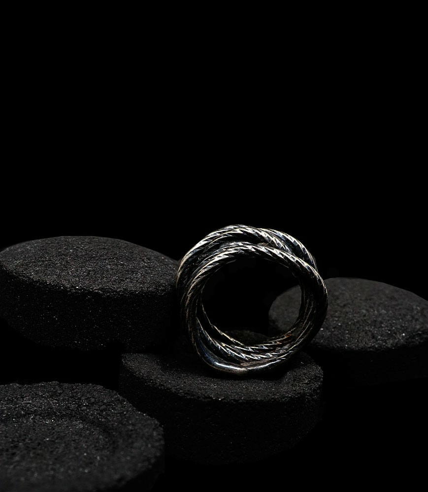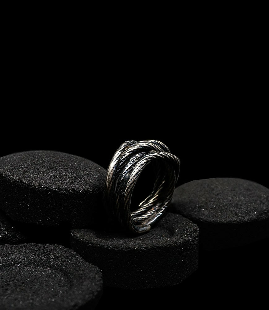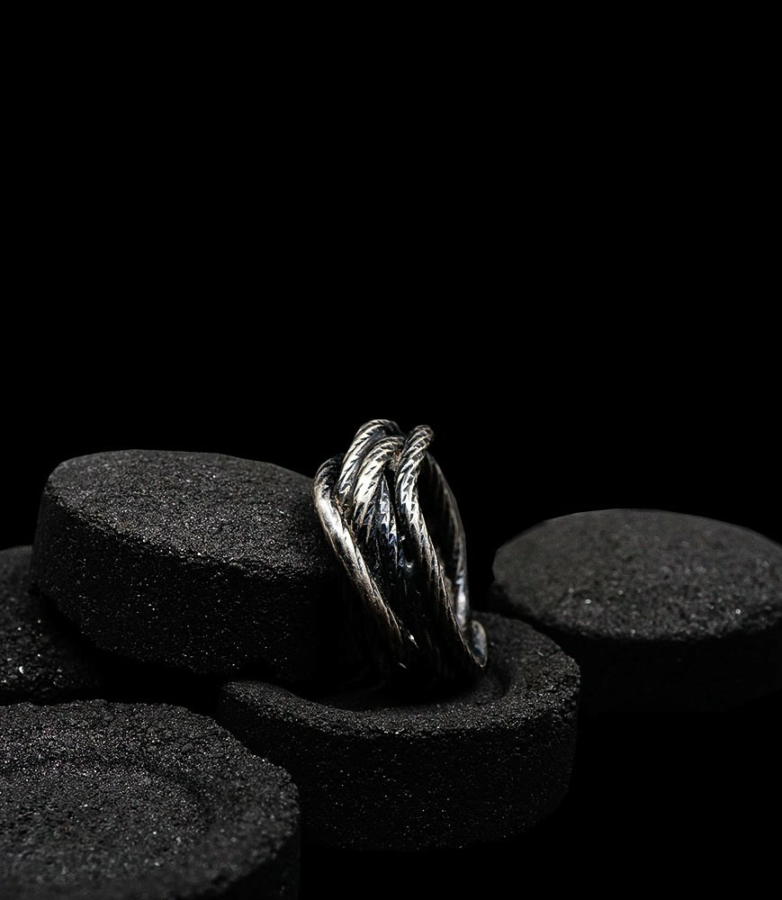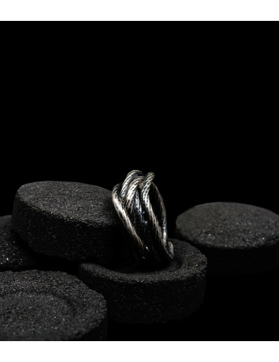 L'argent au titre légal 925/1000 subit un traitement brutal, rude, le résultat après polissage des bagues, bracelets, colliers, bruts, singuliers et harmonieux.