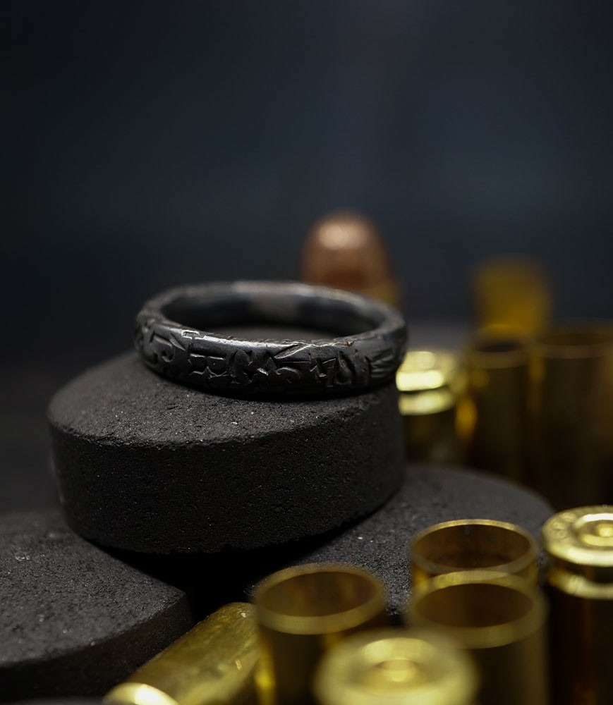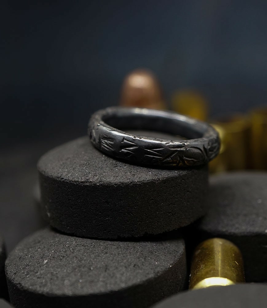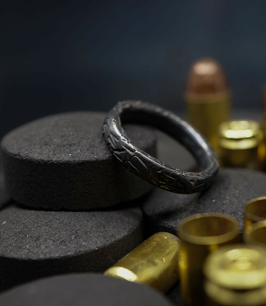 L'argent au titre légal 925/1000 subit un traitement brutal, rude, le résultat après polissage des bagues, bracelets, colliers, bruts, singuliers et harmonieux.
