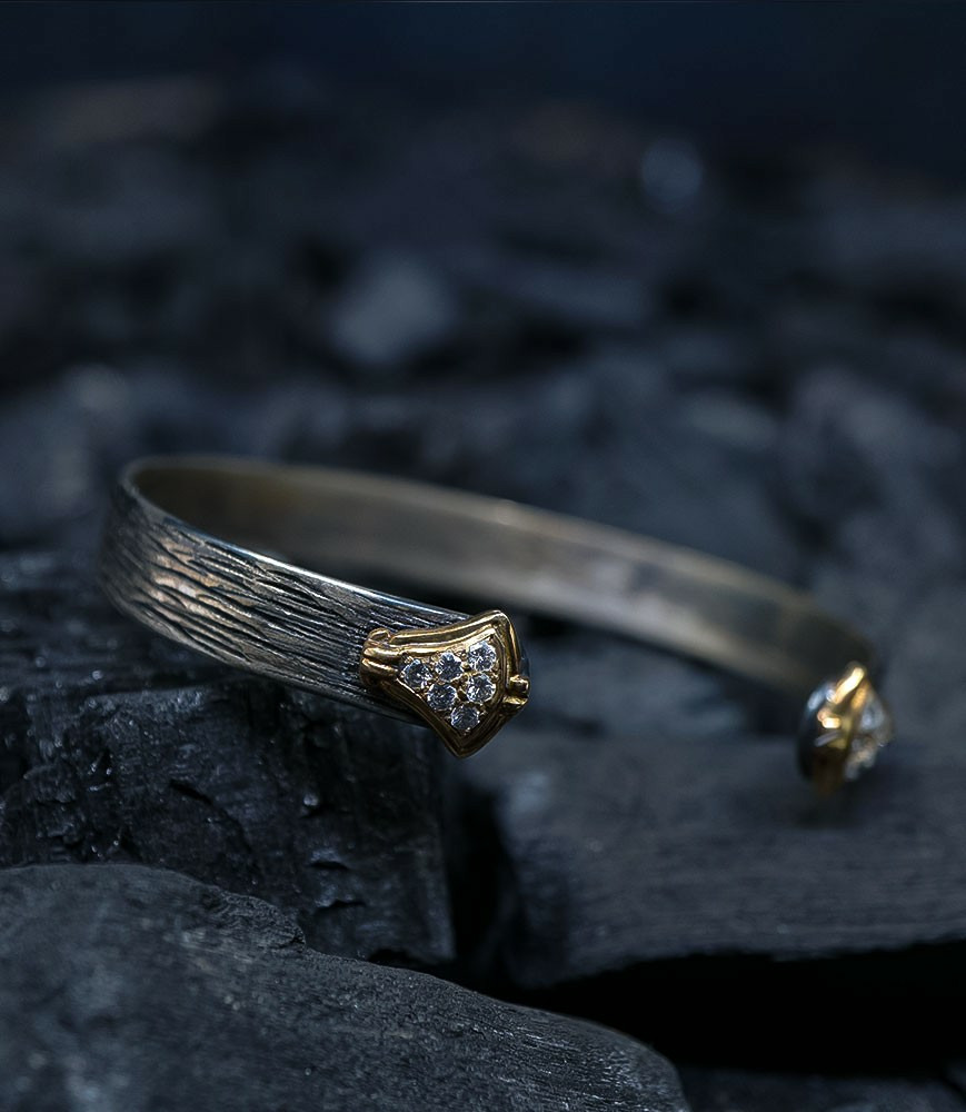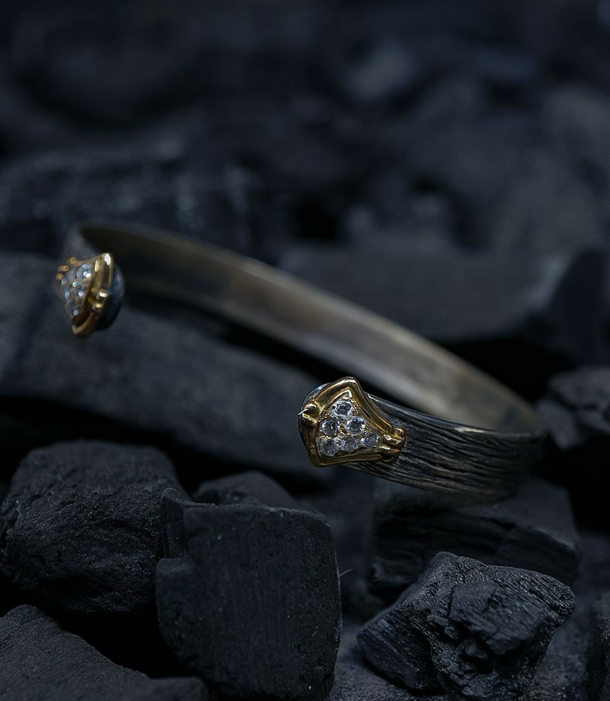 L'argent au titre légal 925/1000 subit un traitement brutal, rude, le résultat après polissage des bagues, bracelets, colliers, bruts, singuliers et harmonieux.