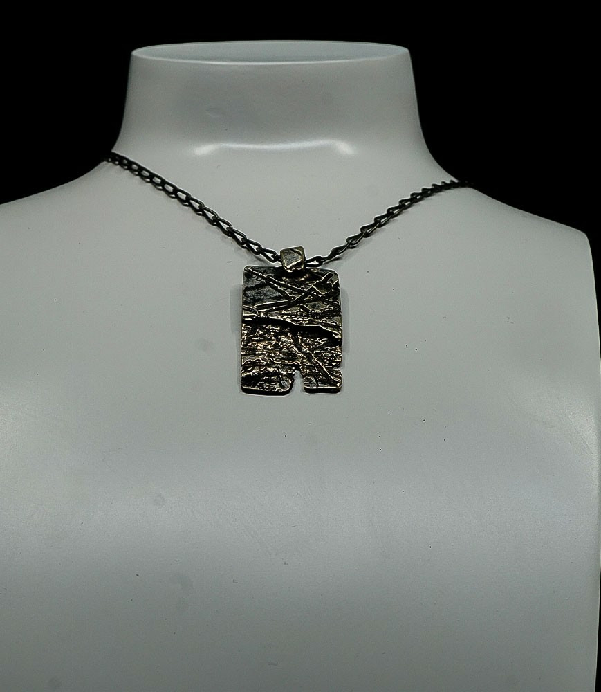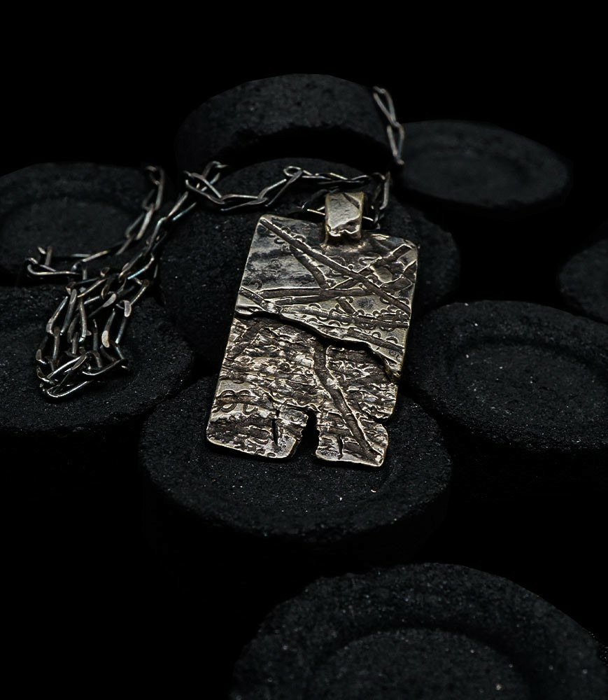 Unicité renforcée par la patine noircie appliquée sur l'argent 925/1000 qui s'estompe peu à peu avec le temps. Vivant, le bijou révèlera des zones où l'aspect brillant du métal reprendra ses droits.