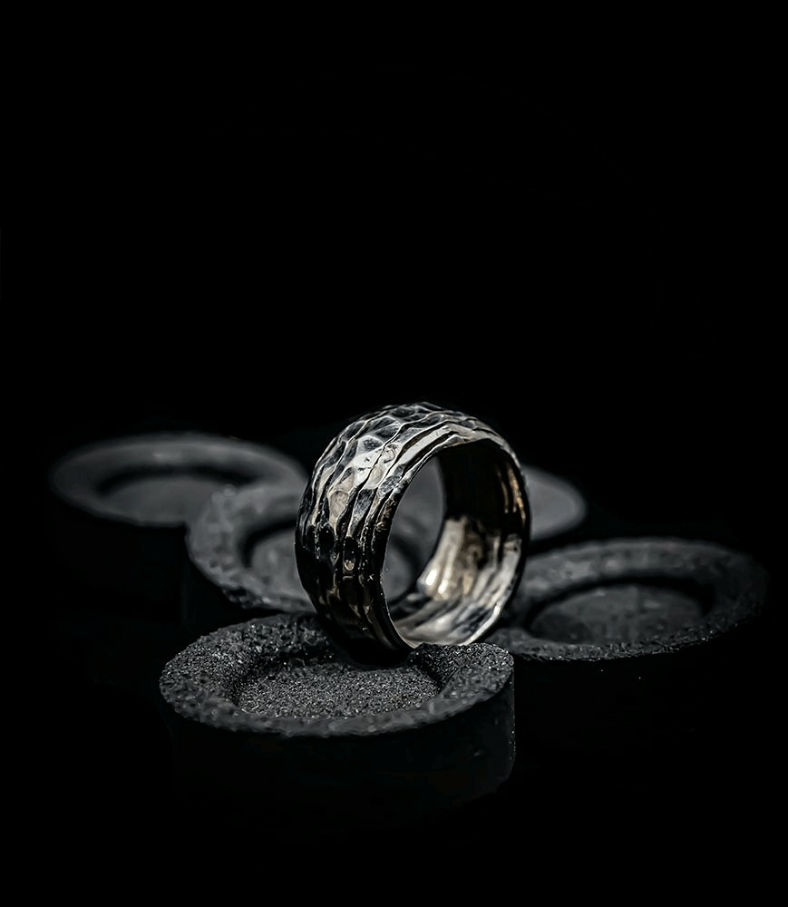 L'argent au titre légal 925/1000 subit un traitement brutal, rude, le résultat après polissage des bagues, bracelets, colliers, bruts, singuliers et harmonieux.