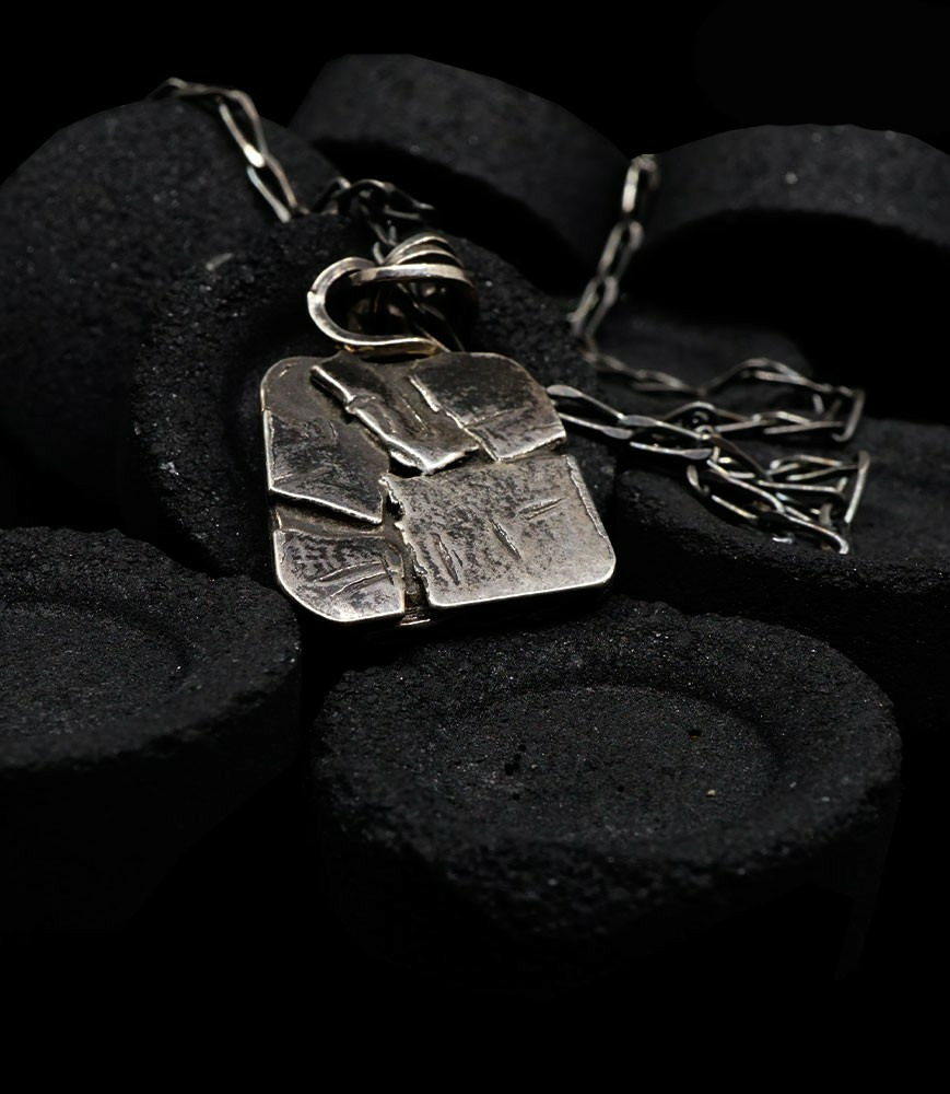 L'argent au titre légal 925/1000 subit un traitement brutal, rude, le résultat après polissage des bagues, bracelets, colliers, bruts, singuliers et harmonieux.